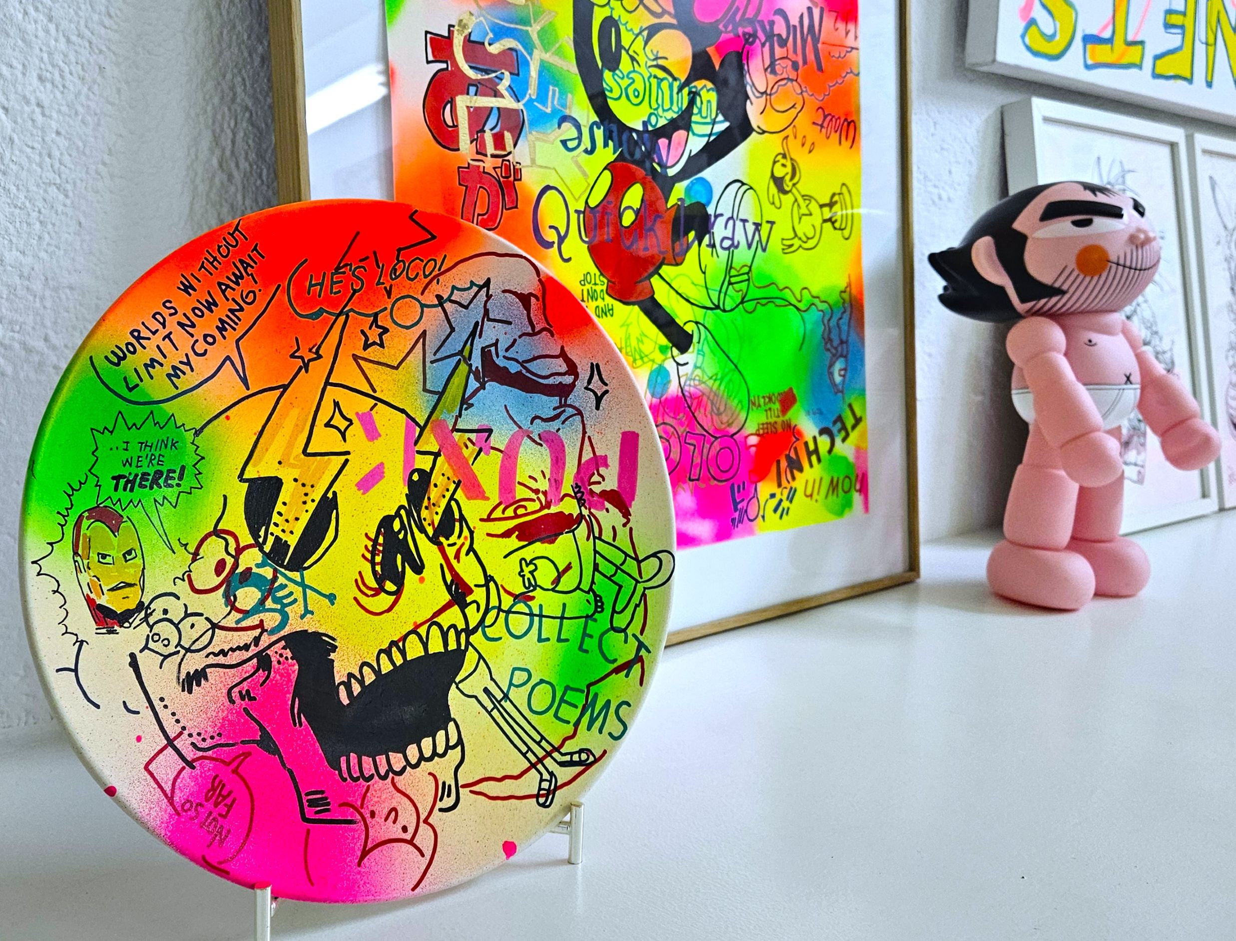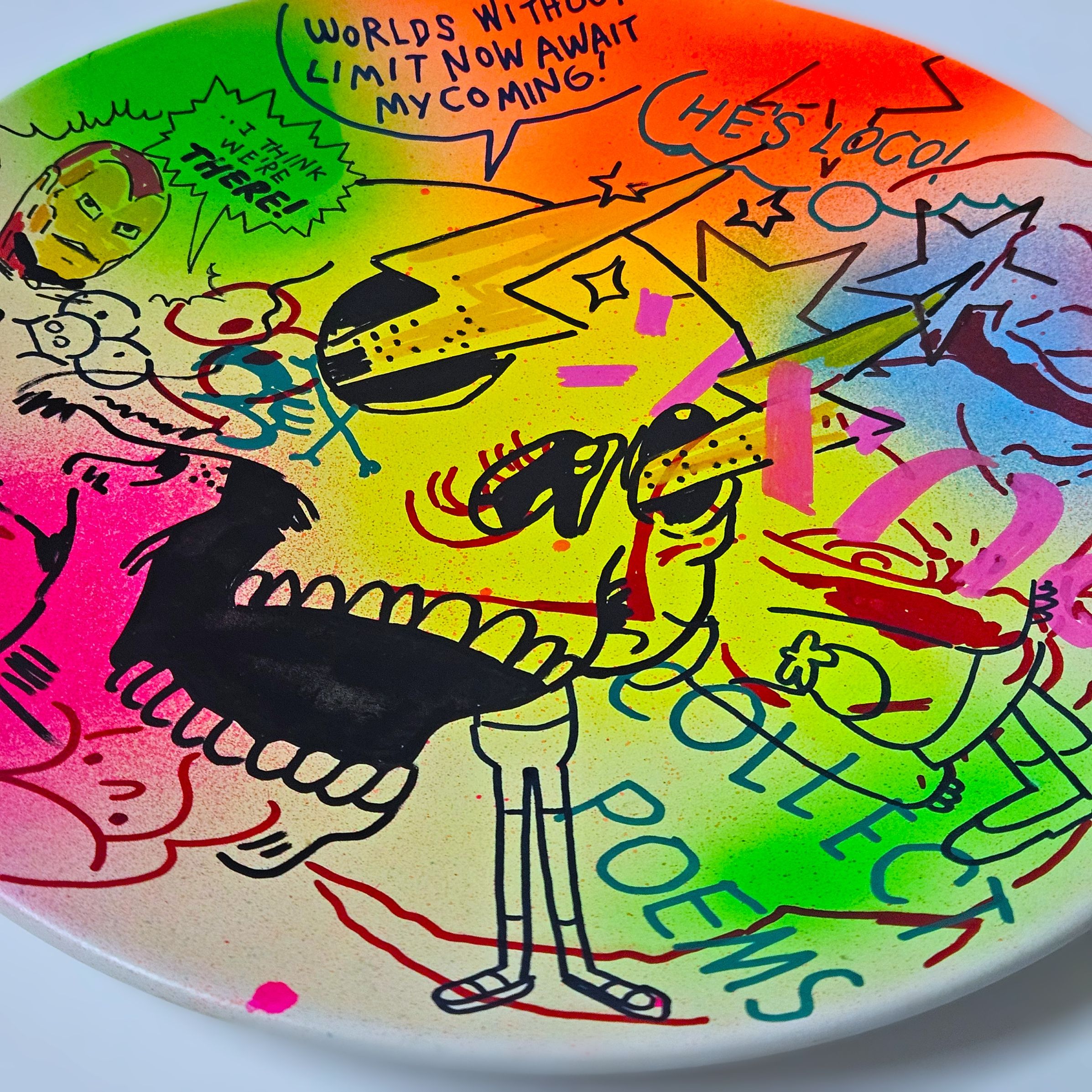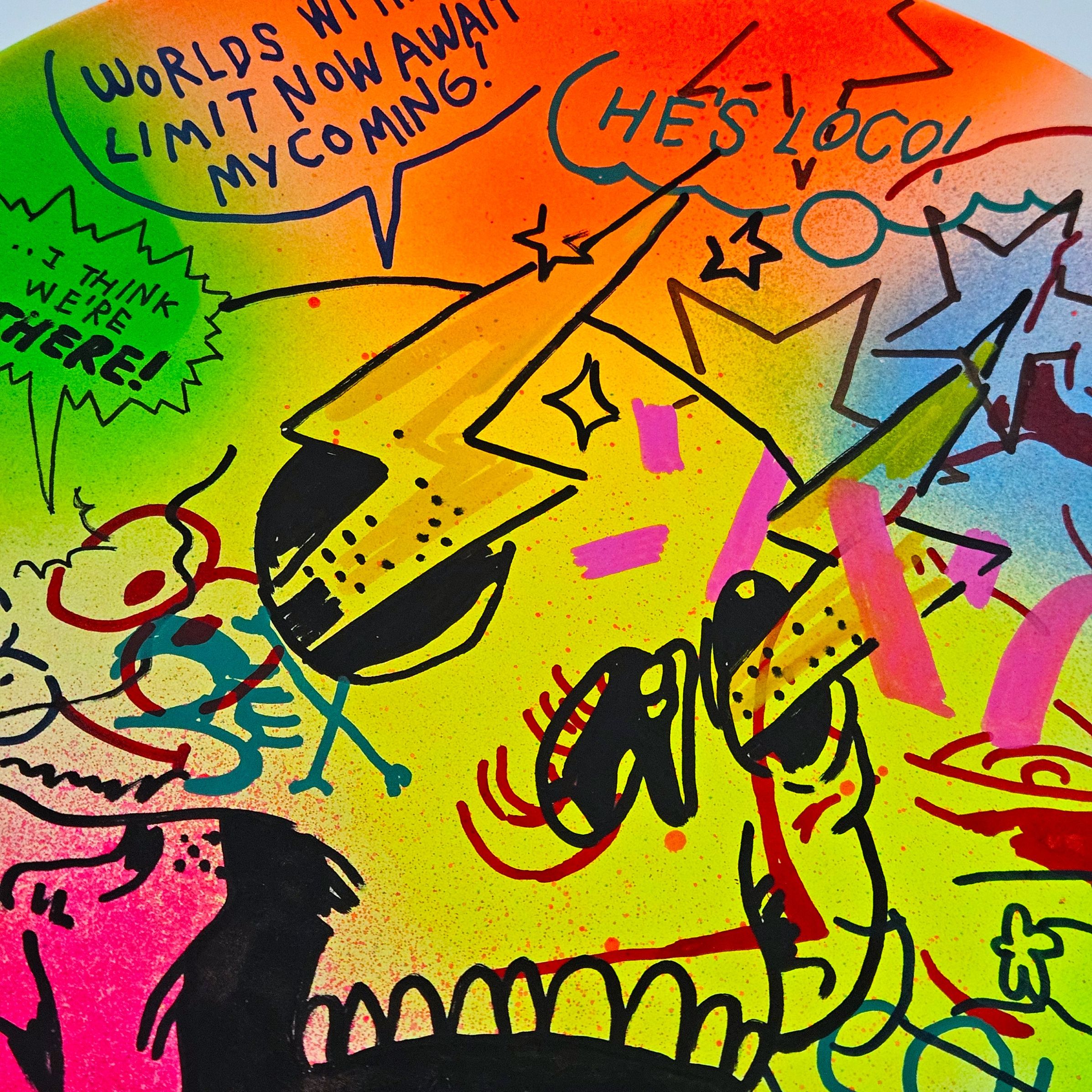 A skull with lightning in its eyes, Iron Man, a distorted Joker, frenetic strokes, and messages that oscillate between madness and provocation: "Worlds without limit now await my coming", "He's loco!", "Collect poems"...