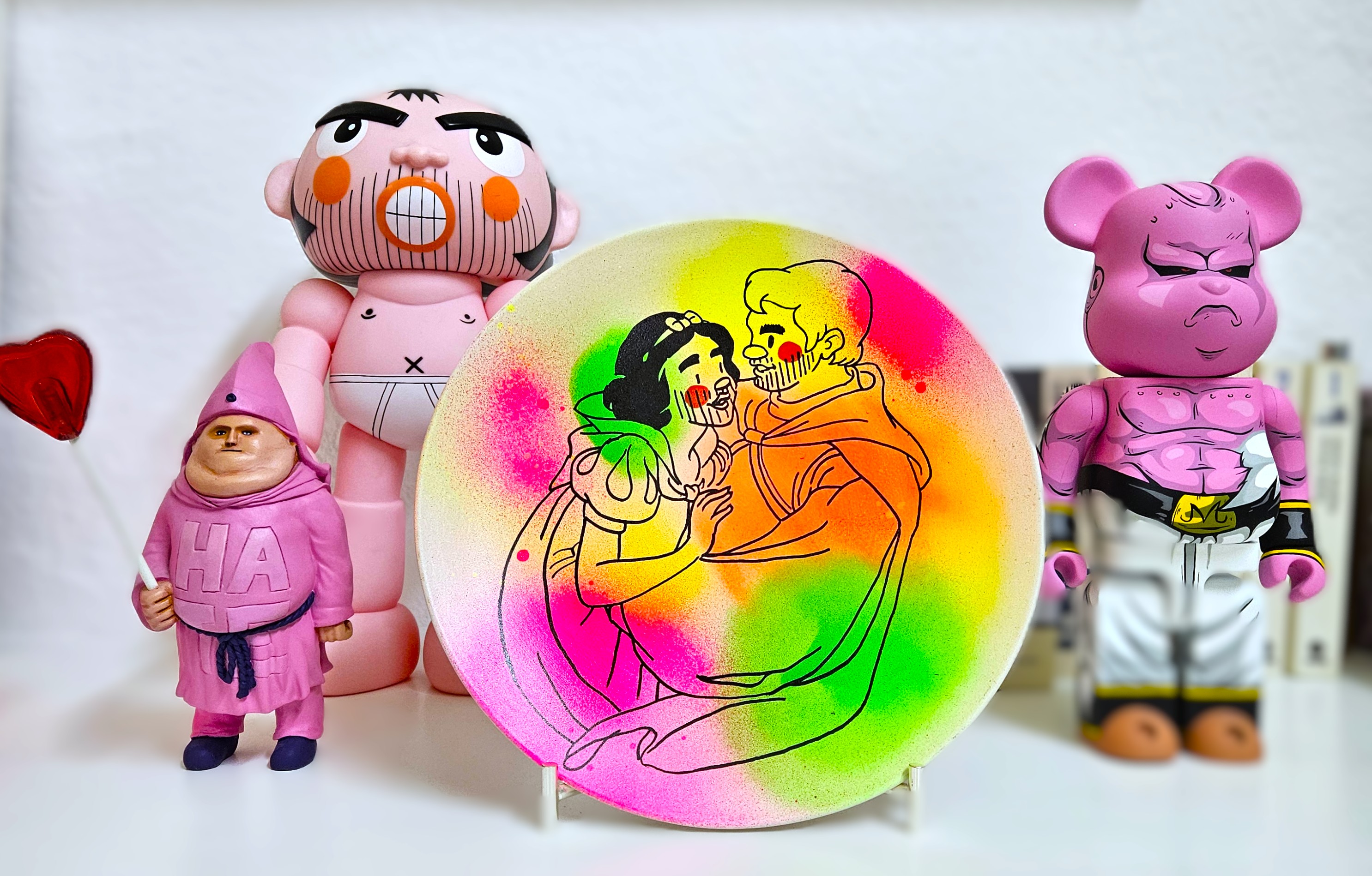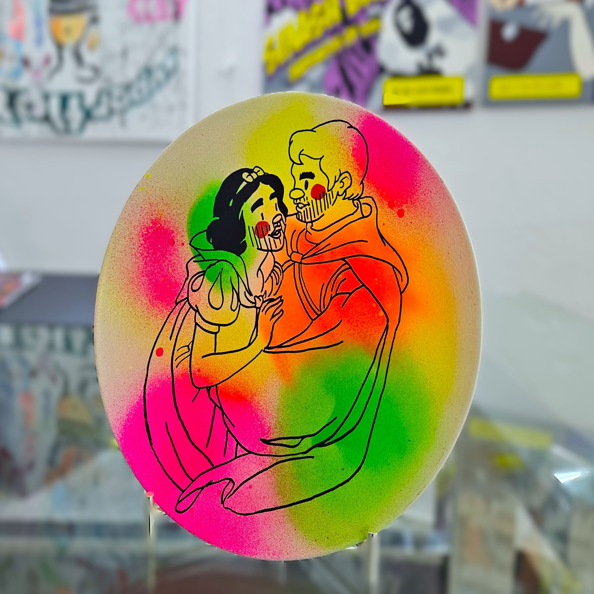 Eternal love, the ideal fantasy… but something feels off. Amid vibrant colors and a distorted classic outline, this piece plays with nostalgia and irony.