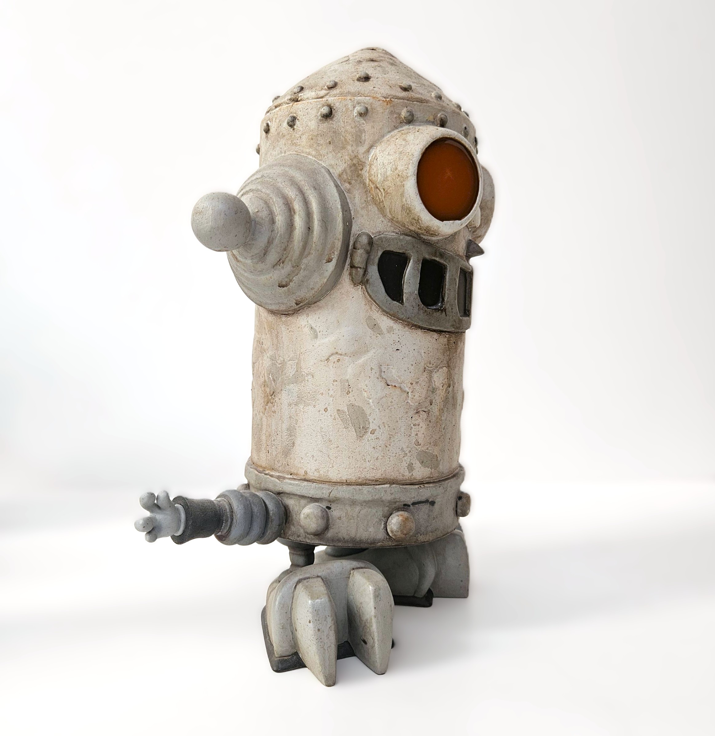 I am the echo of a bygone era, a robot carrying the memories of simpler times, yet there’s something in my eyes that confuses you. There’s innocence in my metal, but also a strange spark that makes you question what I truly am.