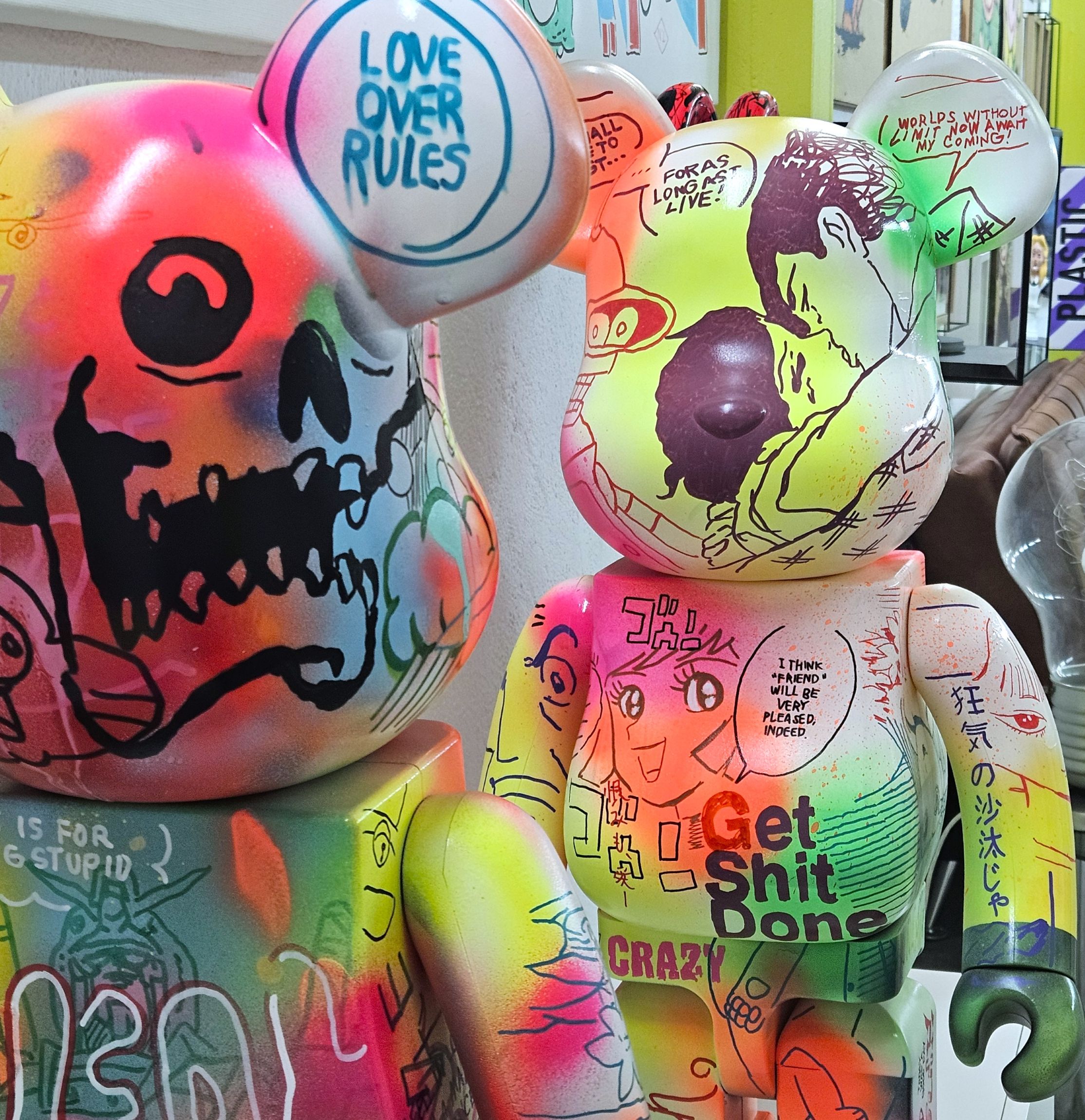 Judas Arrieta intervenes an icon of the Art Toy movement with an aesthetic that explodes. Each stroke is a visual quote. Each color, a statement. His language moves between Japanese Superflat, urban art, and Pop Art: everything is flat, bright, overflowing… but nothing is accidental.