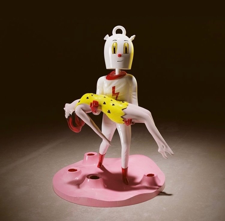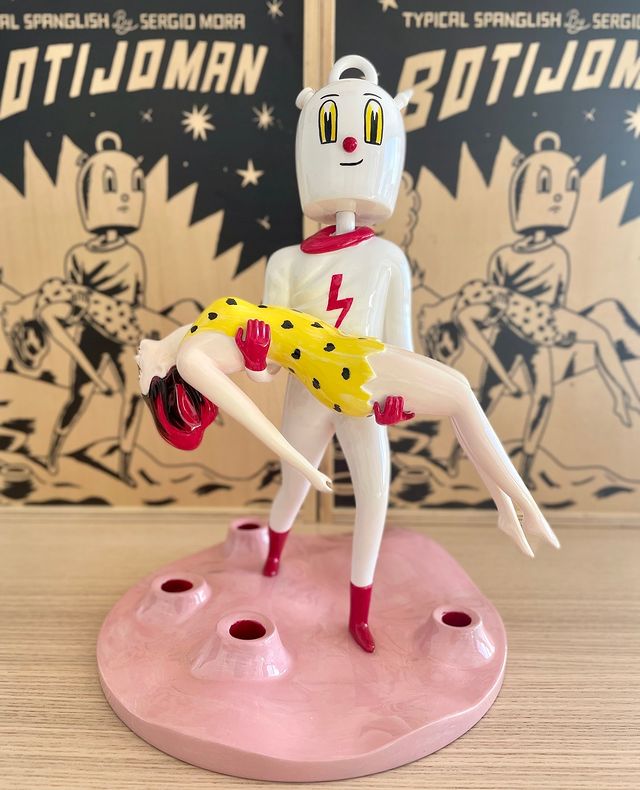 Sergio Mora, a leading figure in Spanish pop surrealism, creates worlds filled with voluptuous characters and cultural nods. Born in Barcelona, he won a Latin Grammy in 2016 for El Poeta Halley by Love of Lesbian. Among his works is Botijomán, an intergalactic water jug. He has exhibited internationally and designed murals for José Andrés and Philippe Starck's restaurants in Miami and New York.