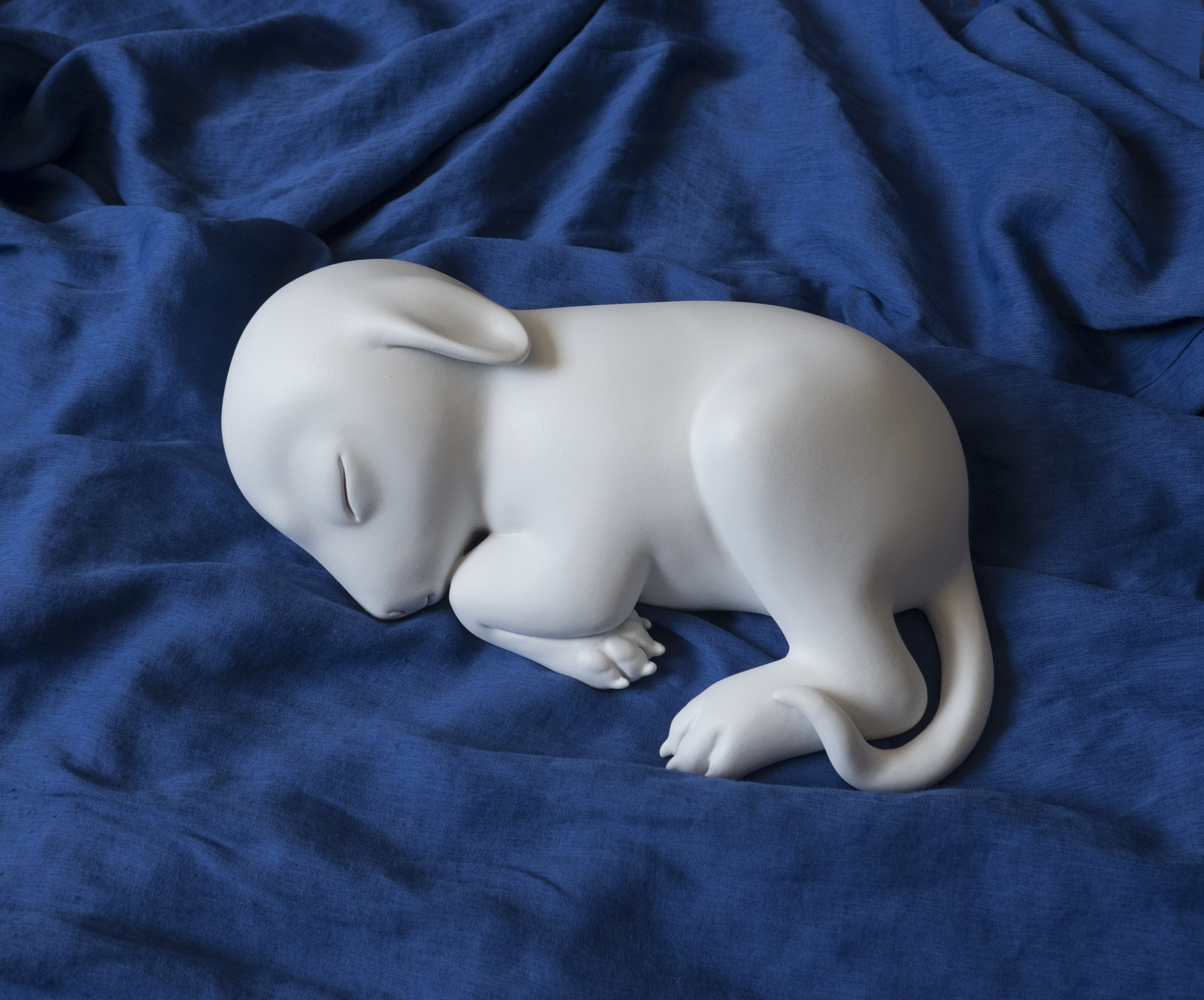 Clémentine Bal (Paris, 1979) is a Fine Arts graduate from Annecy and Dijon, whose work brings to life imaginary creatures that inhabit a serene and timeless universe. Using resins and sealants, she sculpts figures with soft lines and subtle expressions, applying a monochromatic palette that enhances their delicate presence.