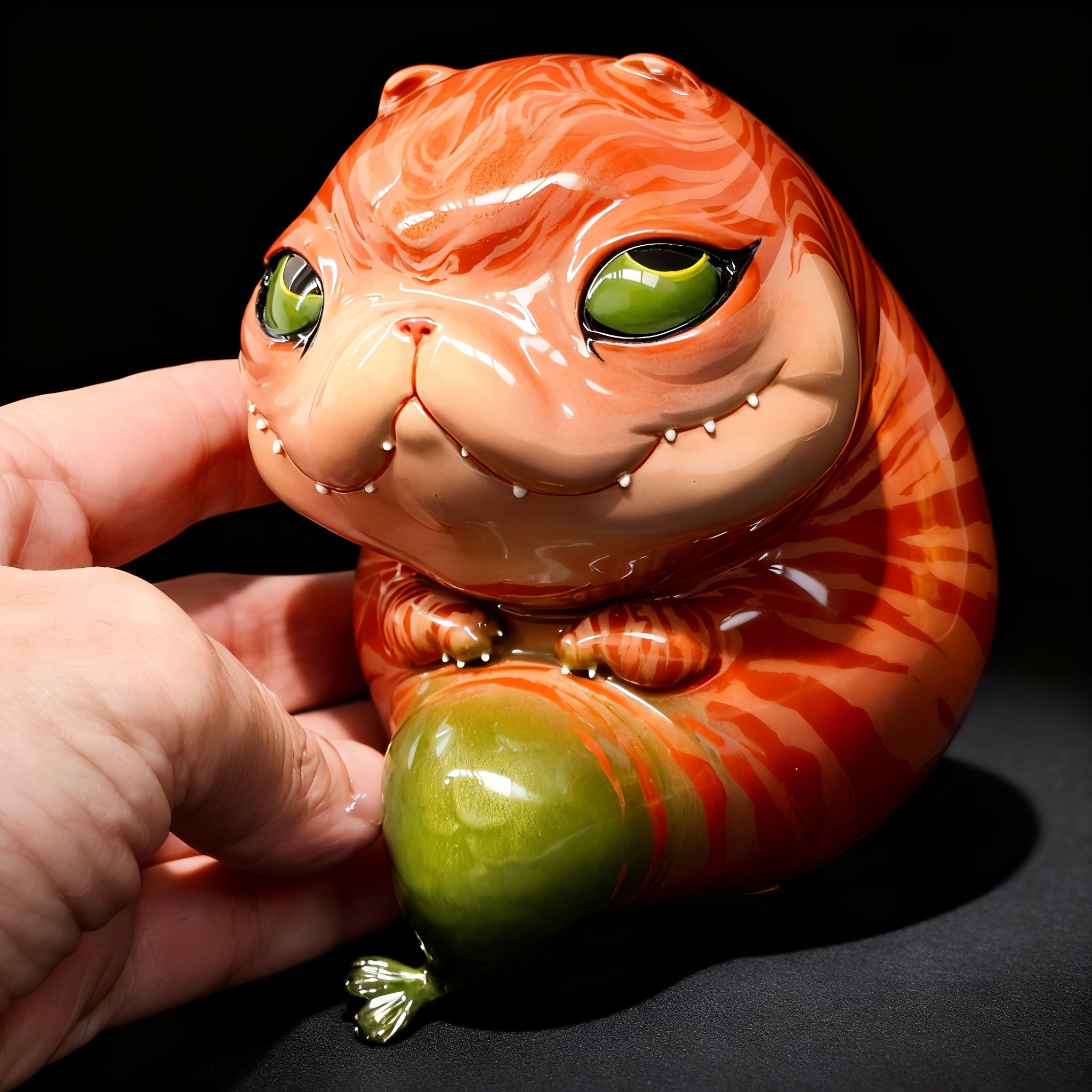 “Sea Mermaid” by Katyushka Art, a hand-painted resin sculpture, turns the adorable into something amphibious, magnetic, and slightly unsettling. Its greenish, almost translucent eyes watch with a calm that doesn’t belong to this world. It isn’t cute: it’s hybrid creepy-cute — half myth, half improbable pet, fully contemporary.
