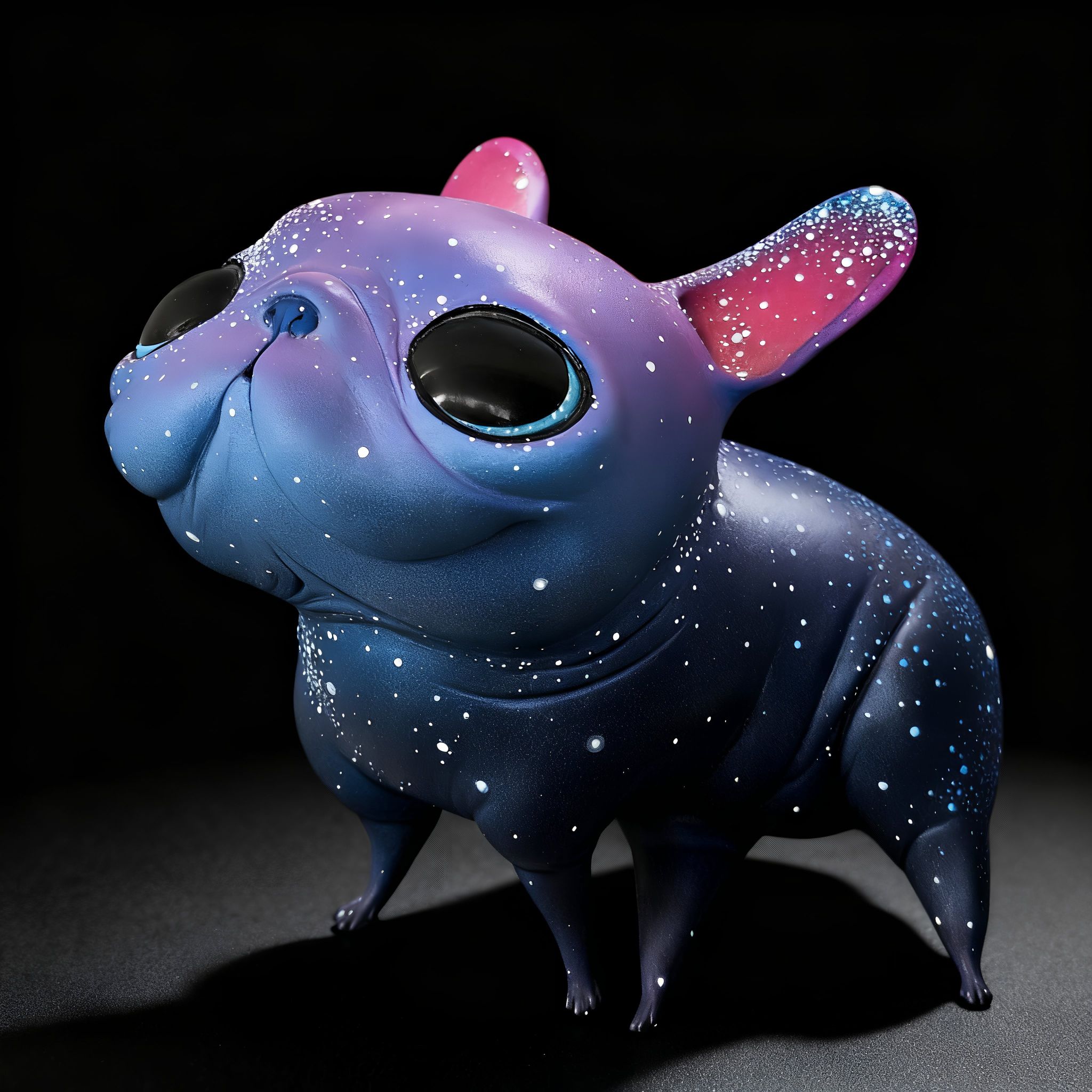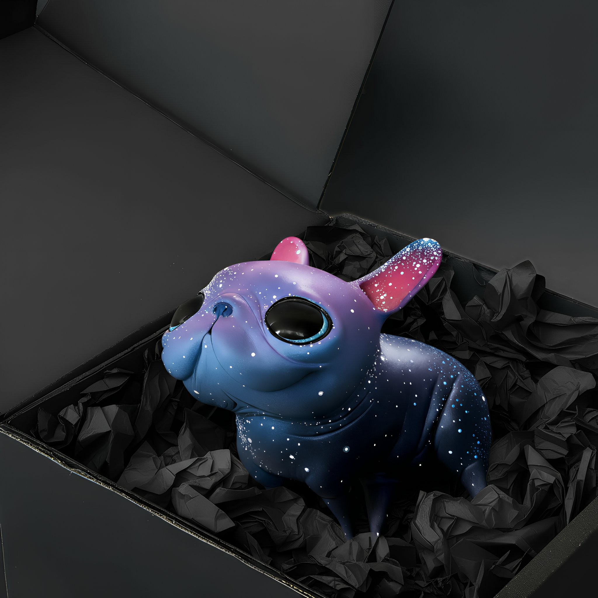 It doesn’t need to bark to stand out. Its violet and blue skin, sprinkled with stars, seems brought from a distant nebula. “Galaxy Dog” by Katyushka Art, a hand-painted resin sculpture, turns cuteness into something cosmic. Its huge, black, glossy eyes absorb light as if they held a universe of their own. It is interstellar creepy-cute: a dog that doesn’t seem born here, but landed in your collection by destiny.