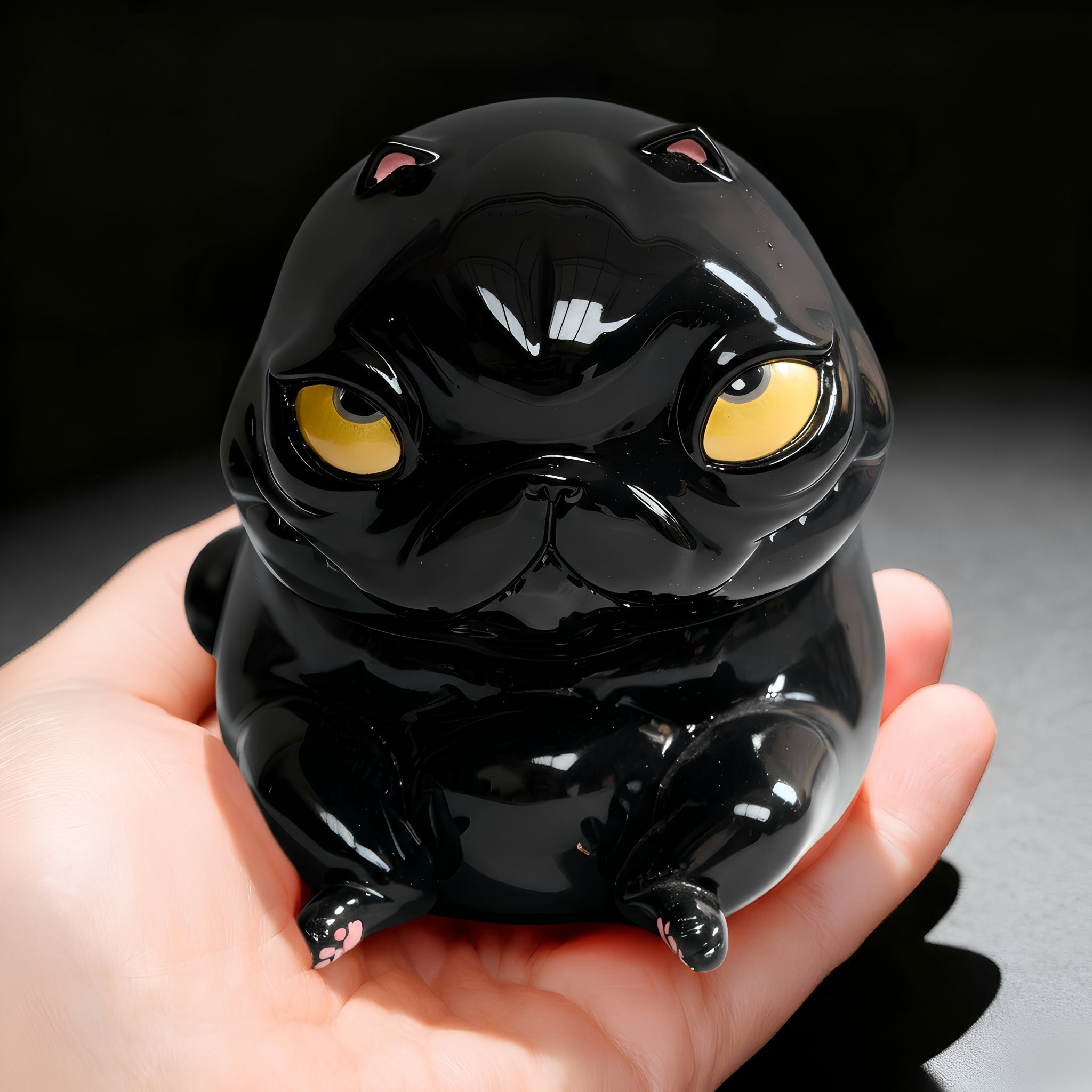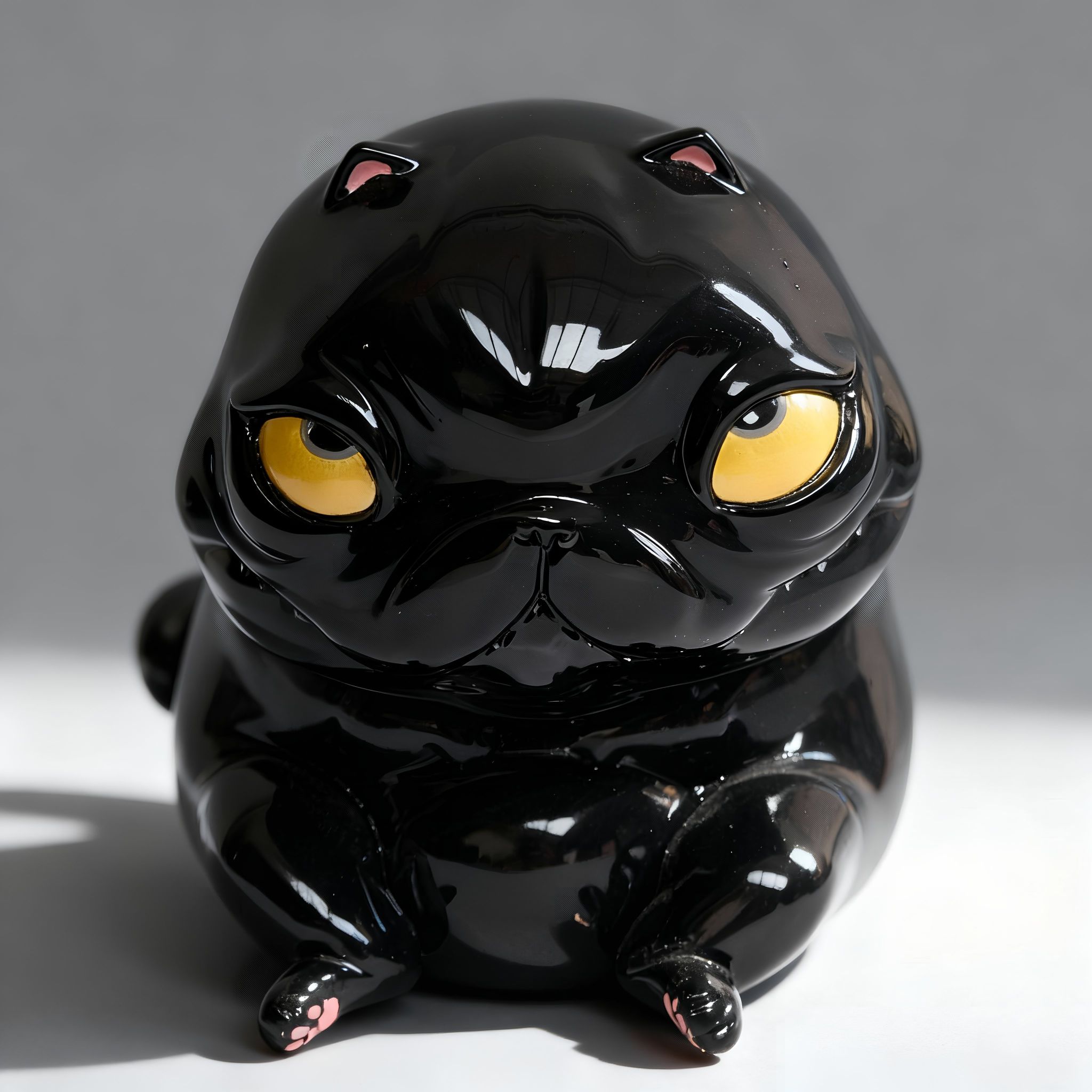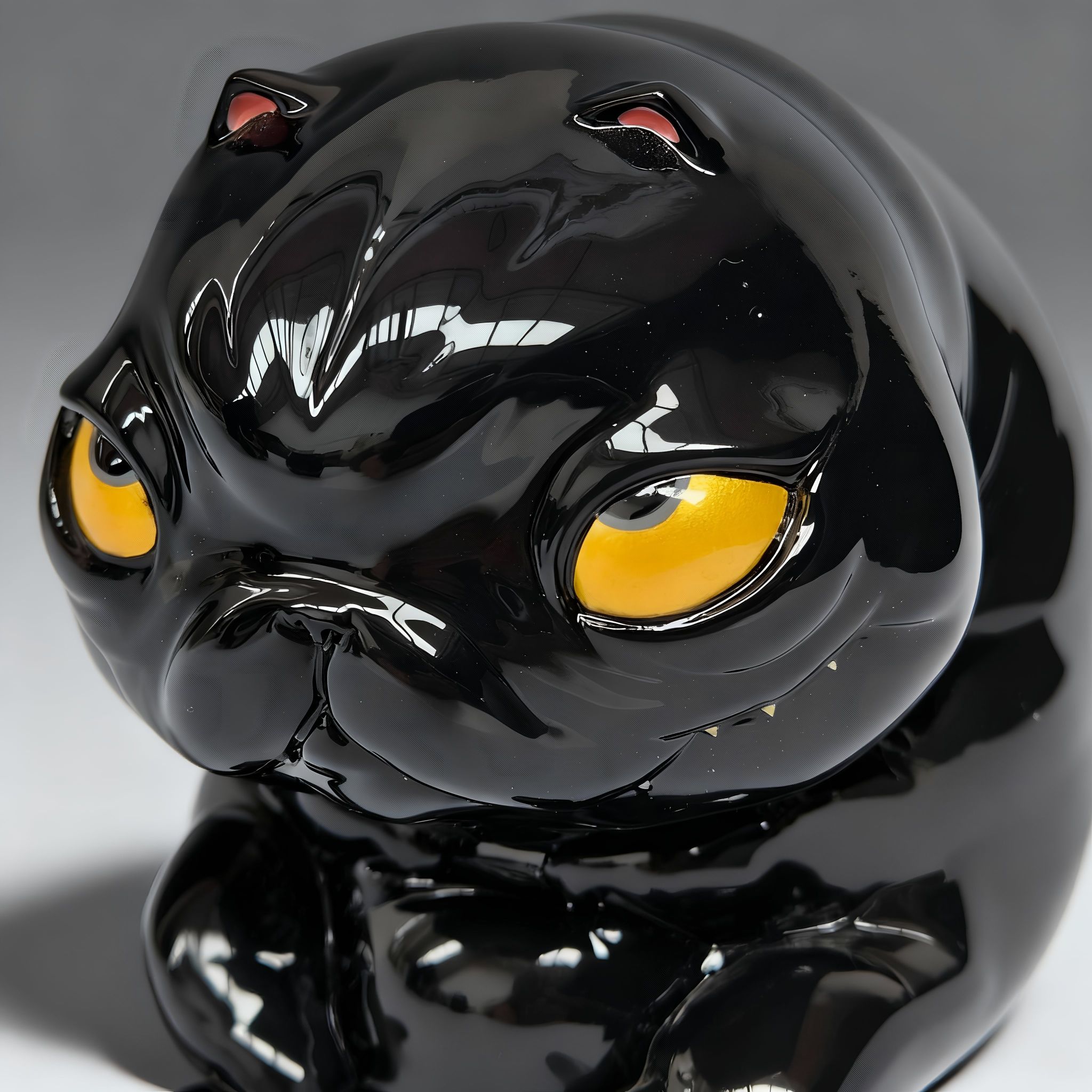 This dark cat by Katyushka Art, a hand-painted resin sculpture, holds its attitude even from the back, where a face blowing a bubble tattooed on its spine adds an insolent detail that turns the piece into a visual strike from every angle.