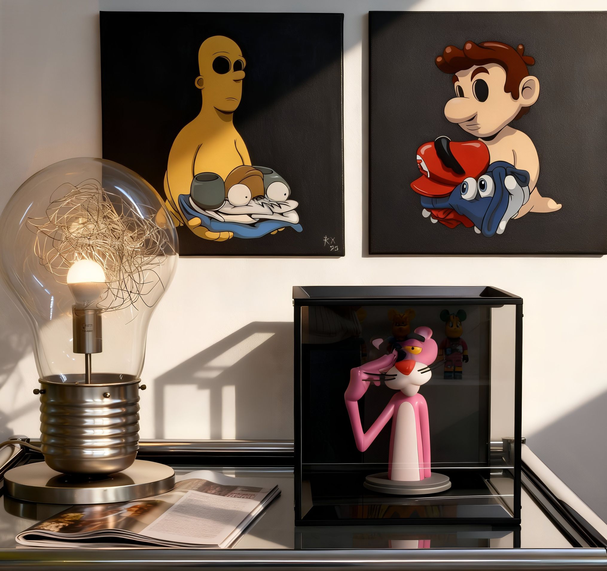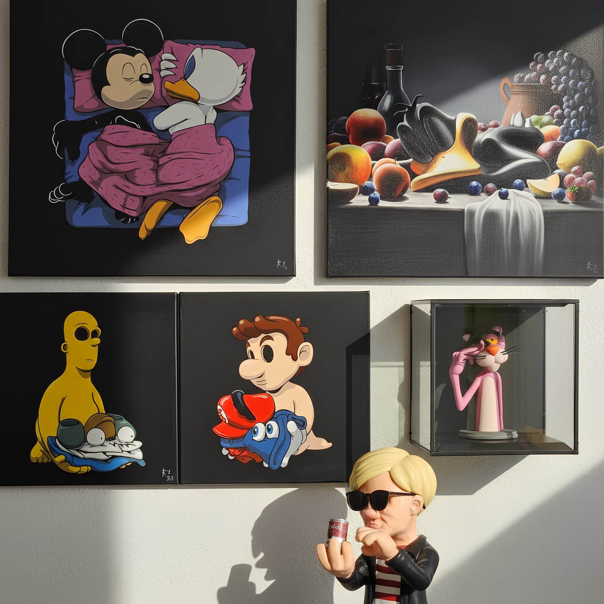 In his universe, nothing is what it seems. Each piece is a visual paradox: caught between play and critique, tenderness and dissonance. A distorting mirror that forces us to look beyond the glossy surface.