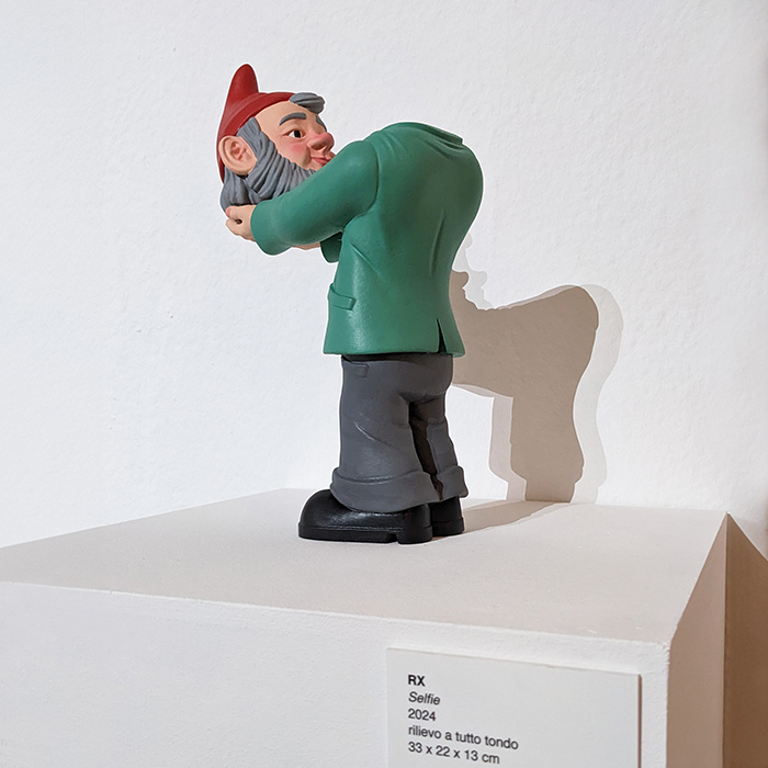 "Selfie" transforms the humble garden gnome into a powerful symbol of introspection, ironically questioning our obsession with image and identity.
