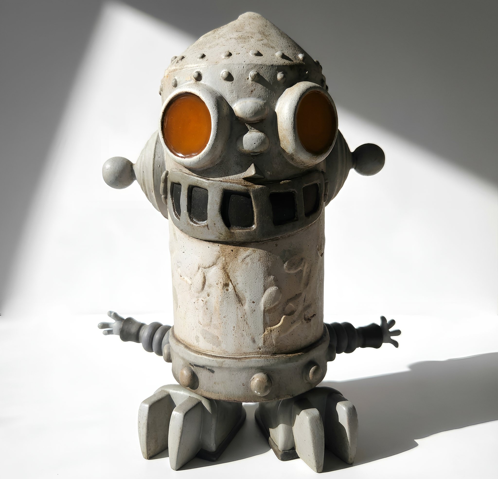 I am the echo of a bygone era, a robot carrying the memories of simpler times, yet there’s something in my eyes that confuses you. There’s innocence in my metal, but also a strange spark that makes you question what I truly am.
