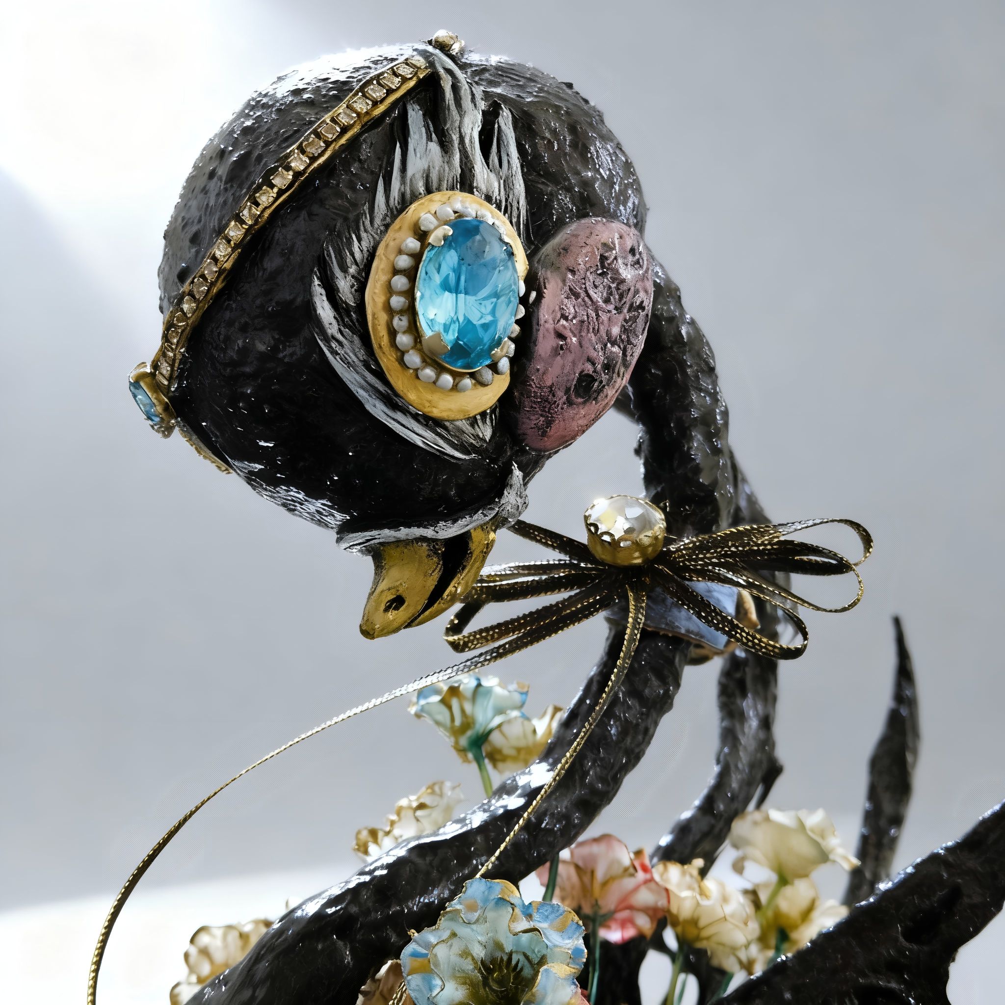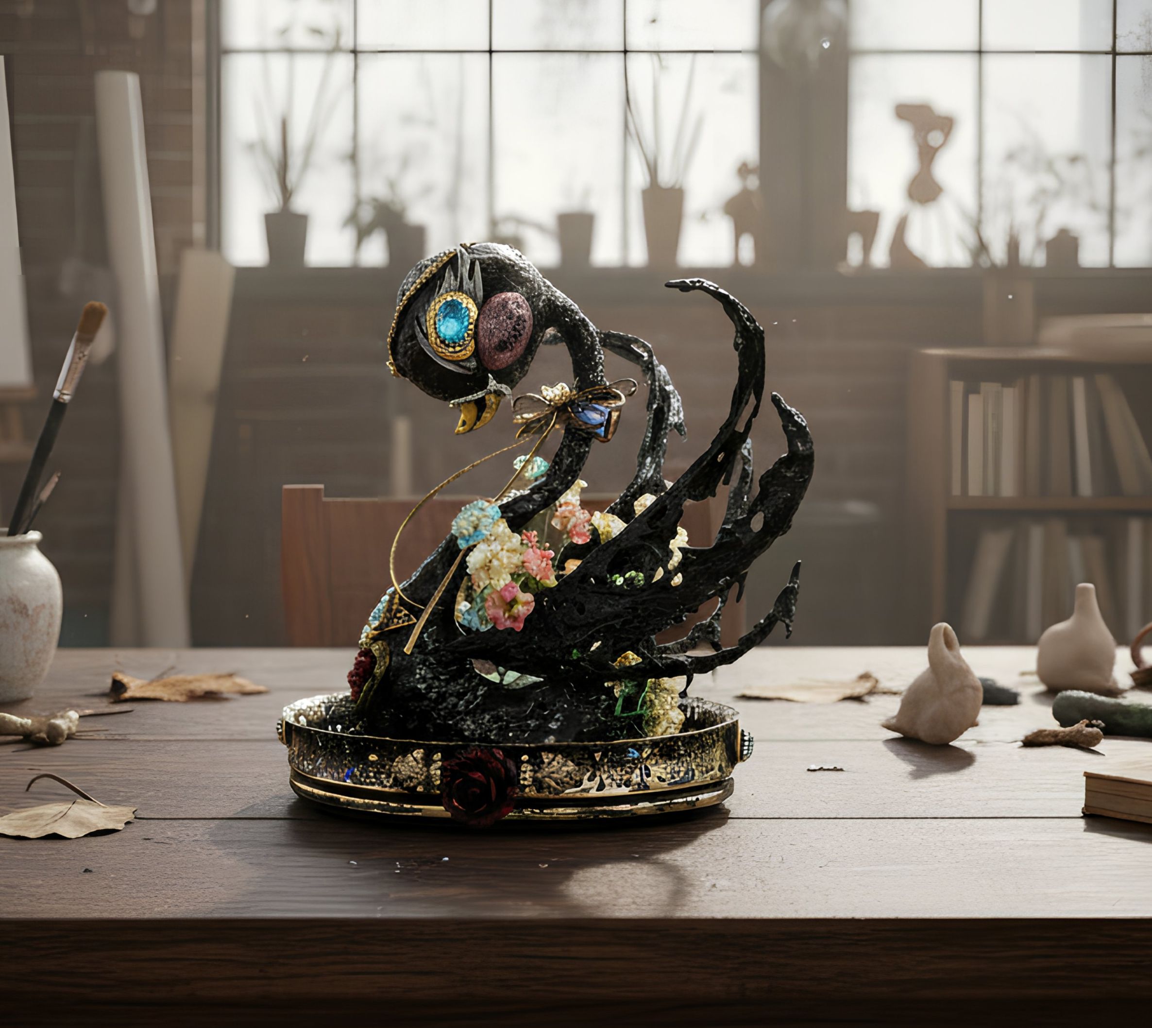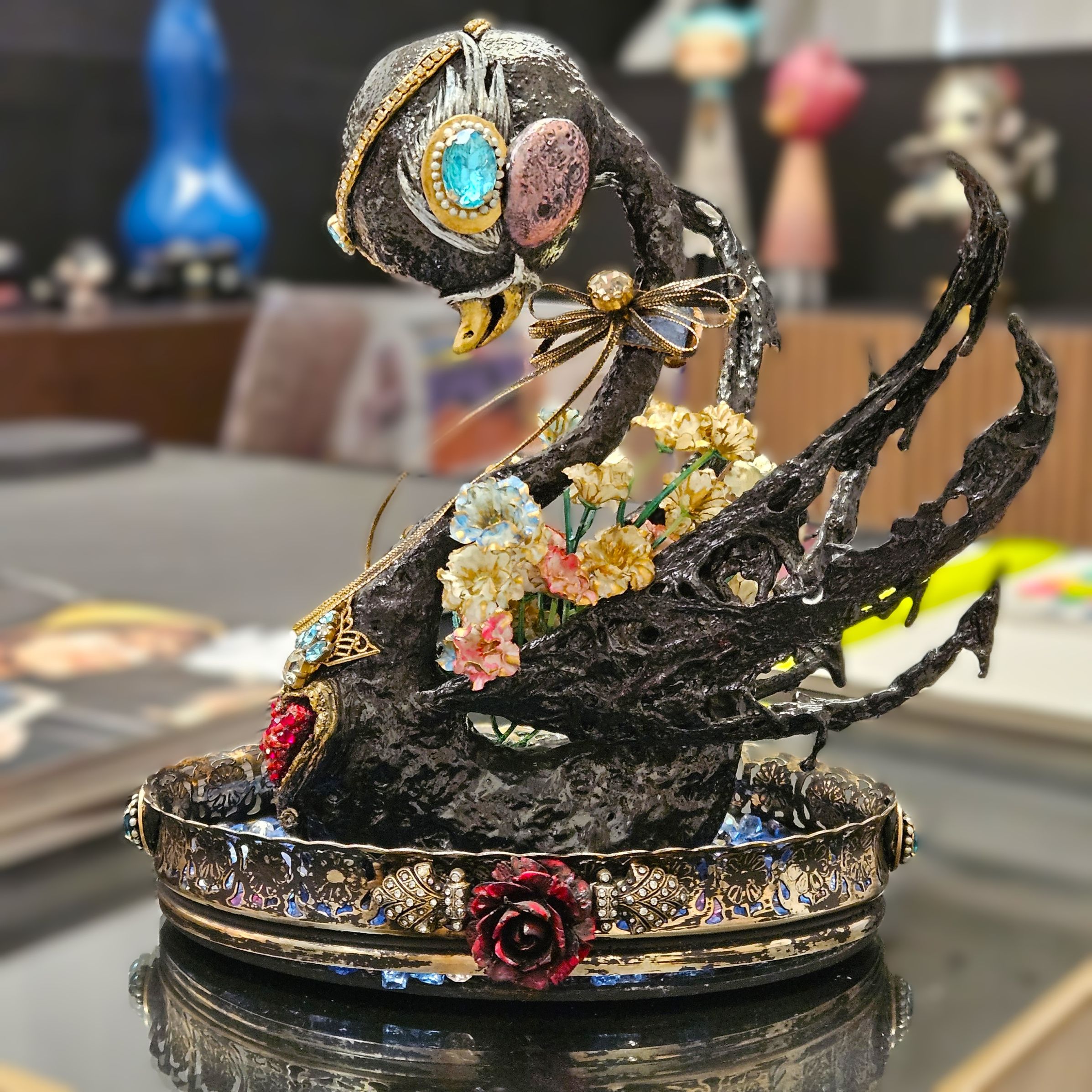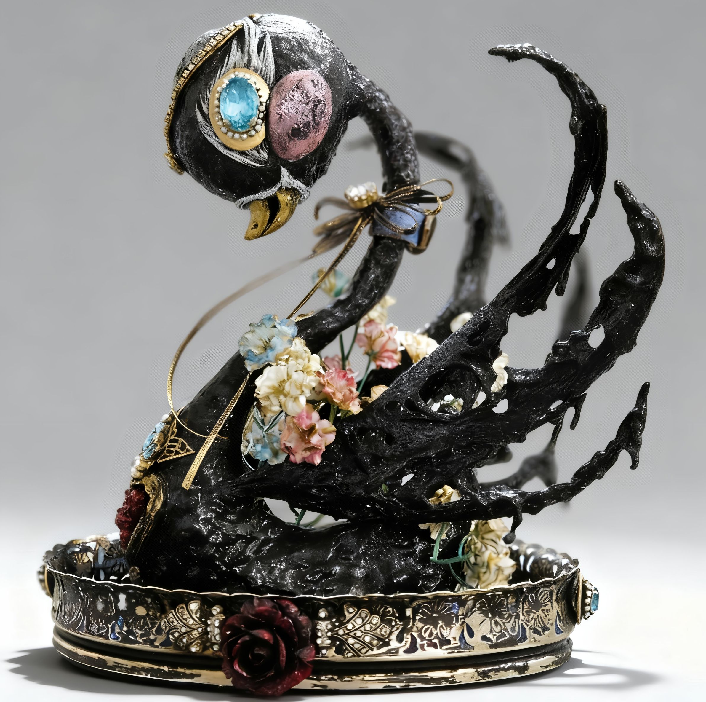 I am a black swan, with a shimmer that holds stories of times long past. Jake Valentin brought me to life with a vintage style that conjures dark and magical worlds.