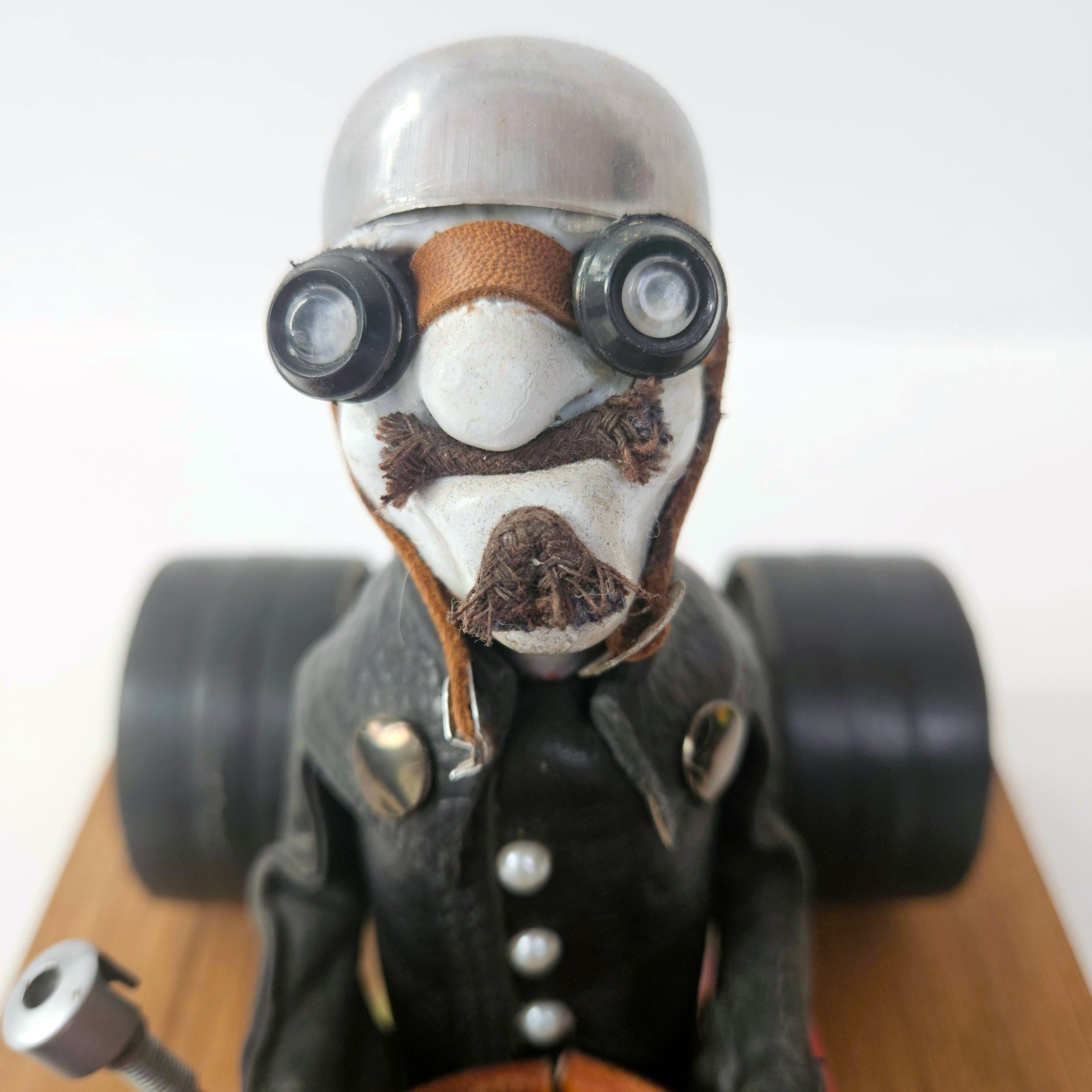 • Technique: Metal structure and recycled materials, head in polimer clay, synthetic leather clothing, accessories in recycled materials.