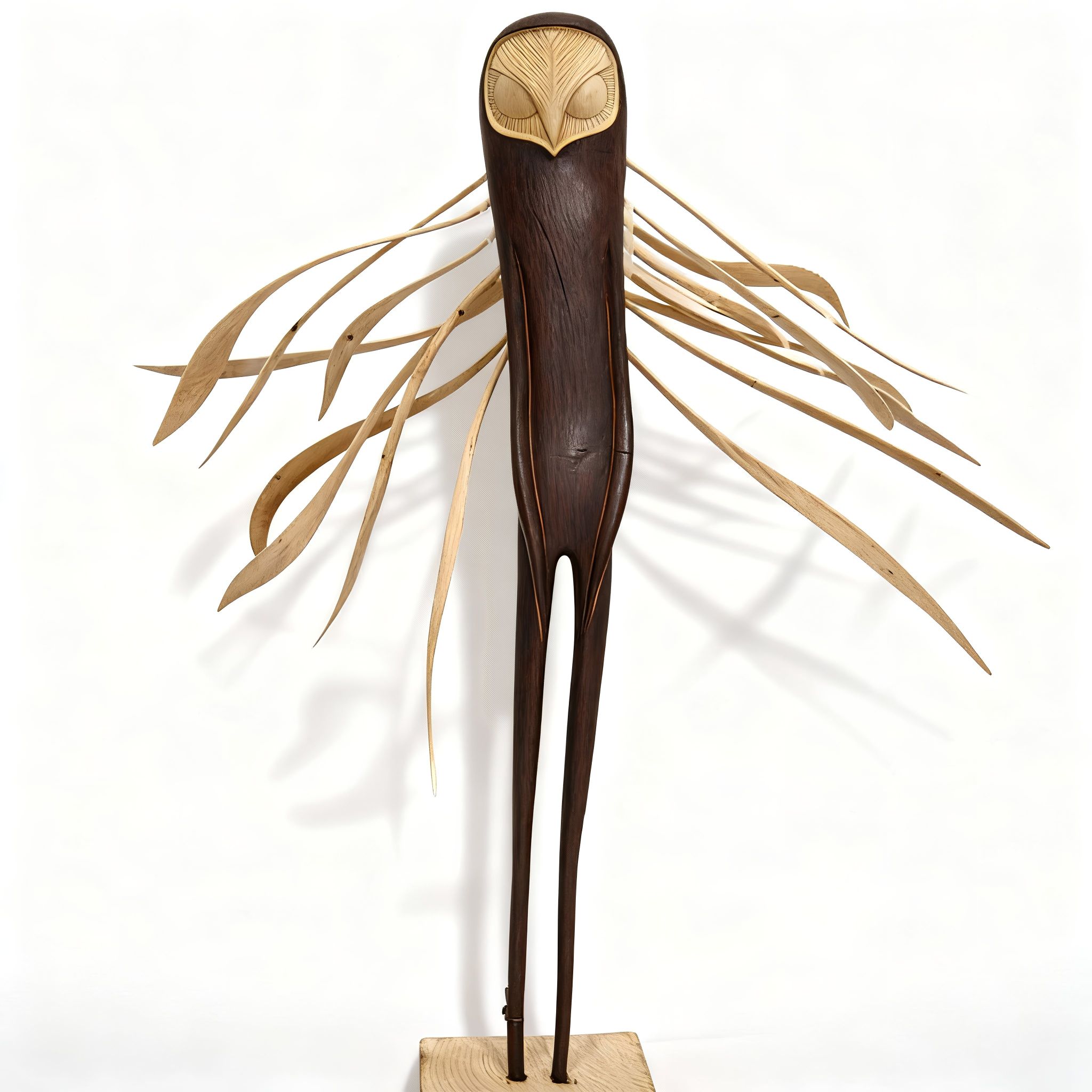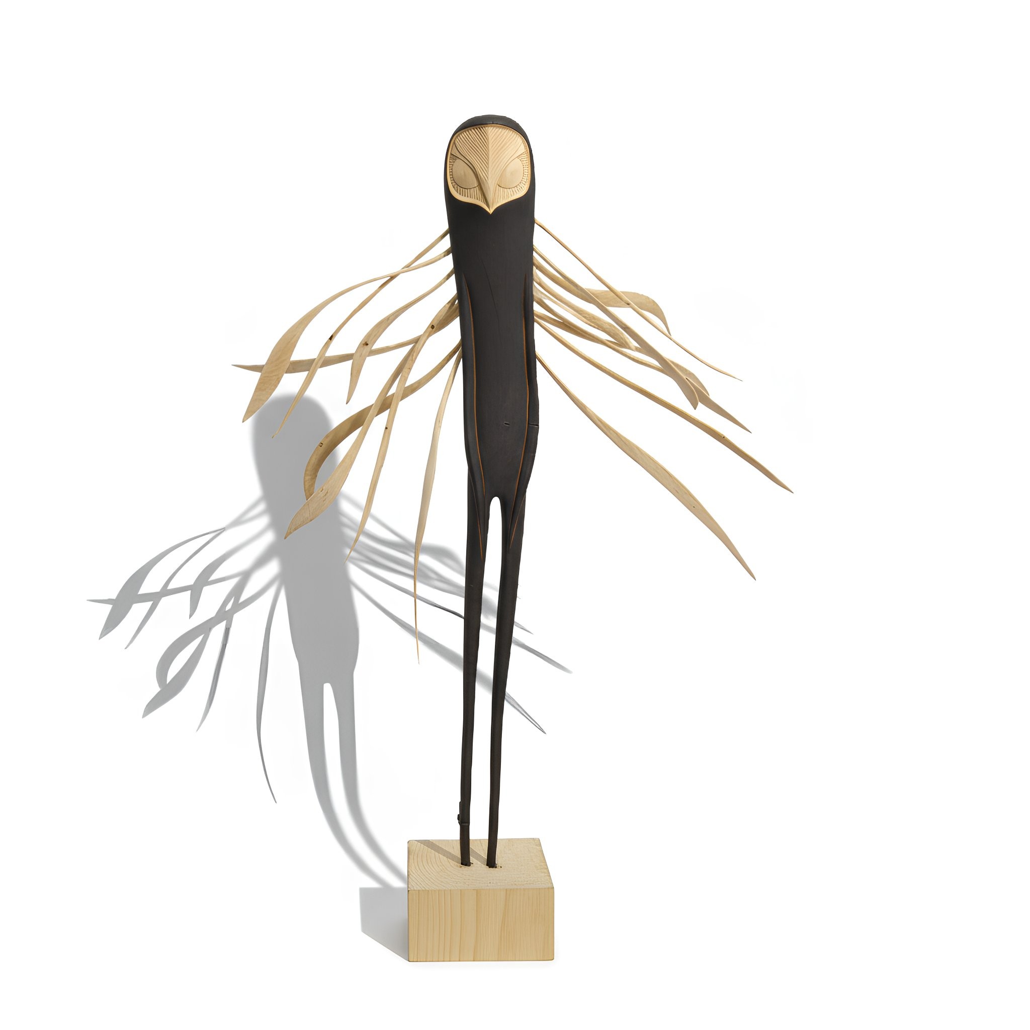 • Technique: Carved from sustainably sourced hawthorn wood, heat-treated, charred for texture and depth, hollowed at the base to prevent cracking, and sealed with Danish oil. The feathers were carved separately from hawthorn wood and are interchangeable.