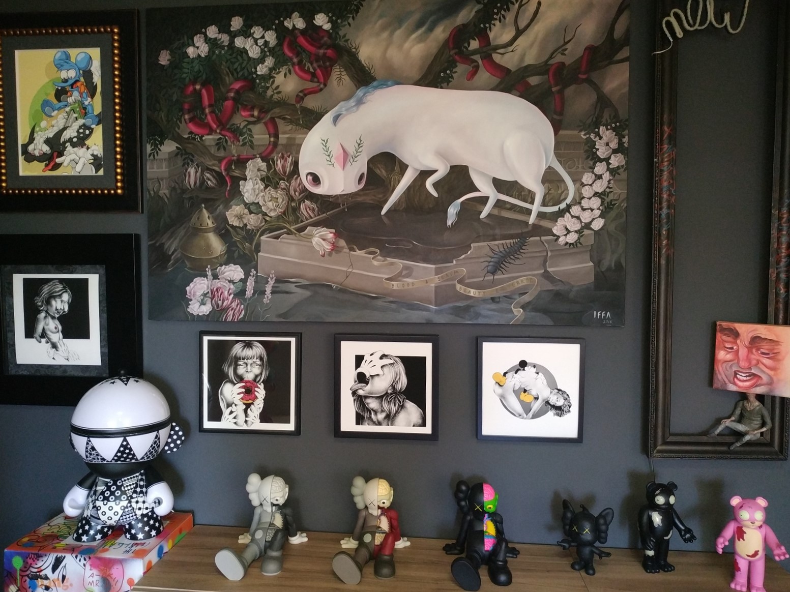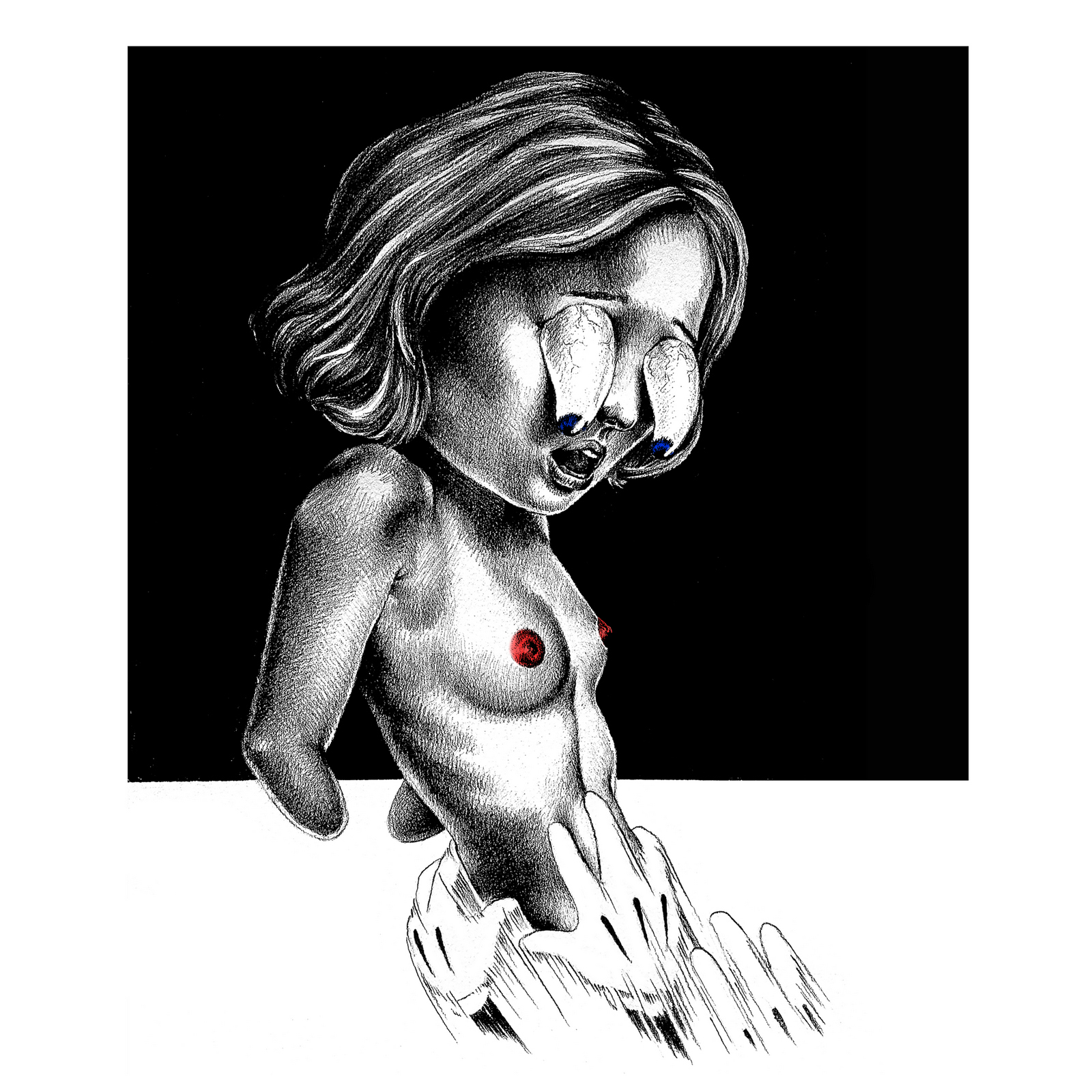 She explores the contradictions between purity and vulgarity, grace and depravity, merging horror and beauty into detailed and defiant artworks.