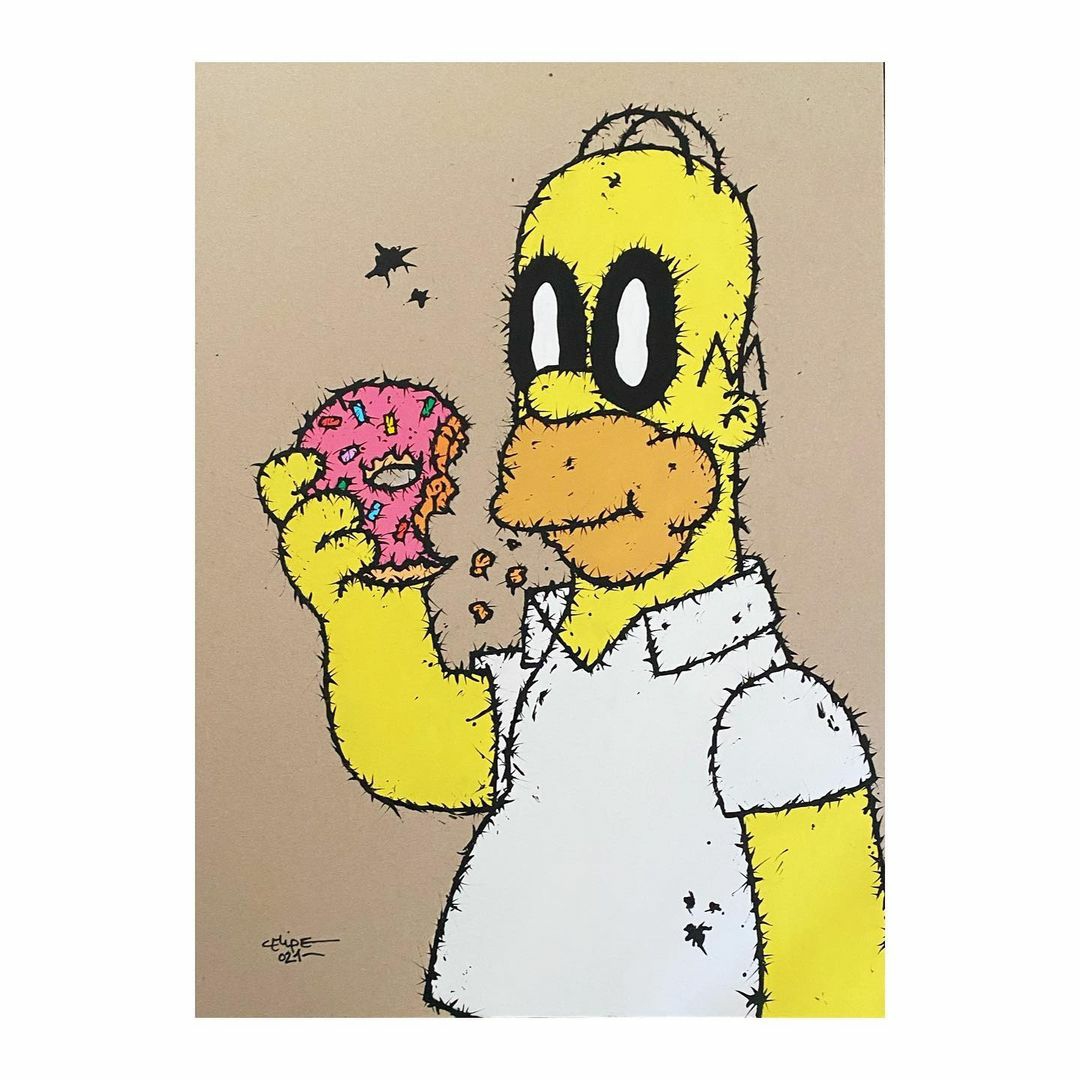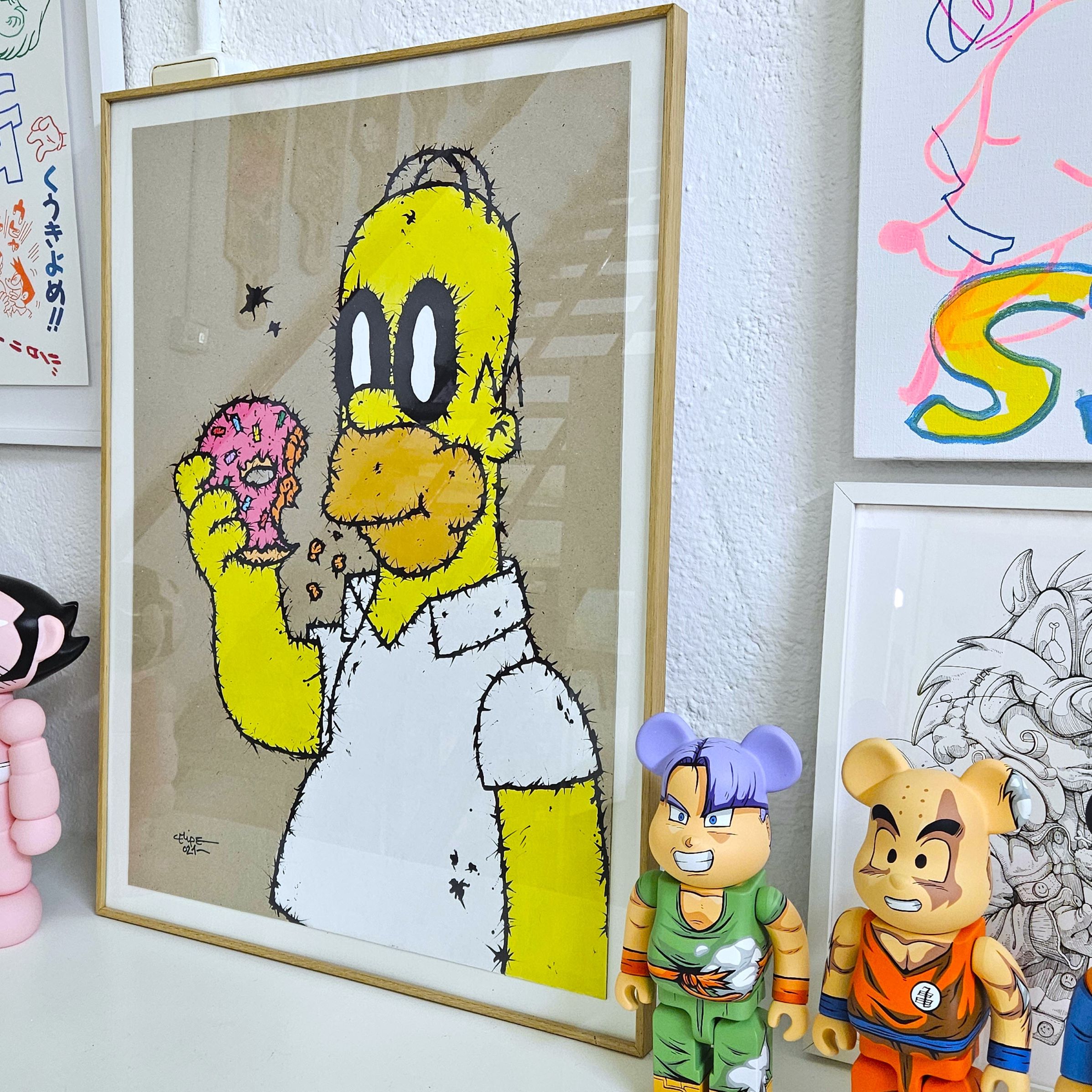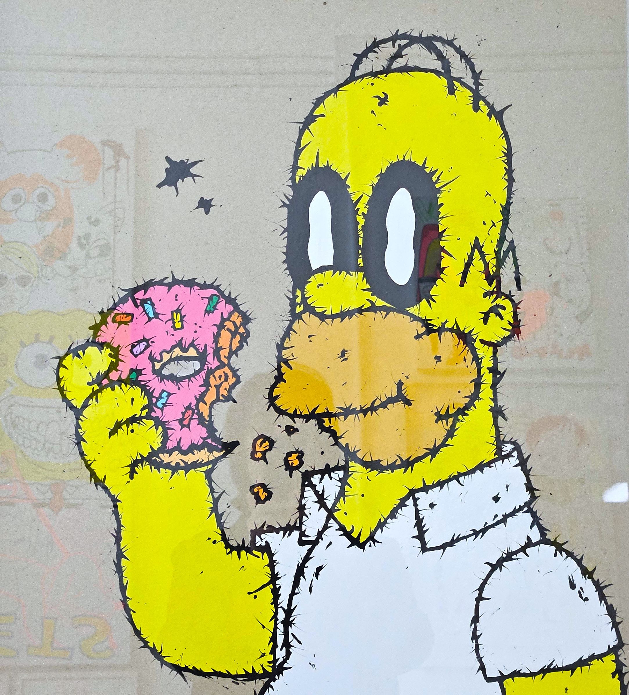 Celipe Perroloco uses Homer to speak about how we chase quick hits of gratification. A dop@mine rush to soothe stress or anxiety, even knowing the satisfaction will be brief… and that the emptiness will follow. This is Neo Pop at its purest: direct, ironic, and laced with a rawness that hides beneath a familiar icon.