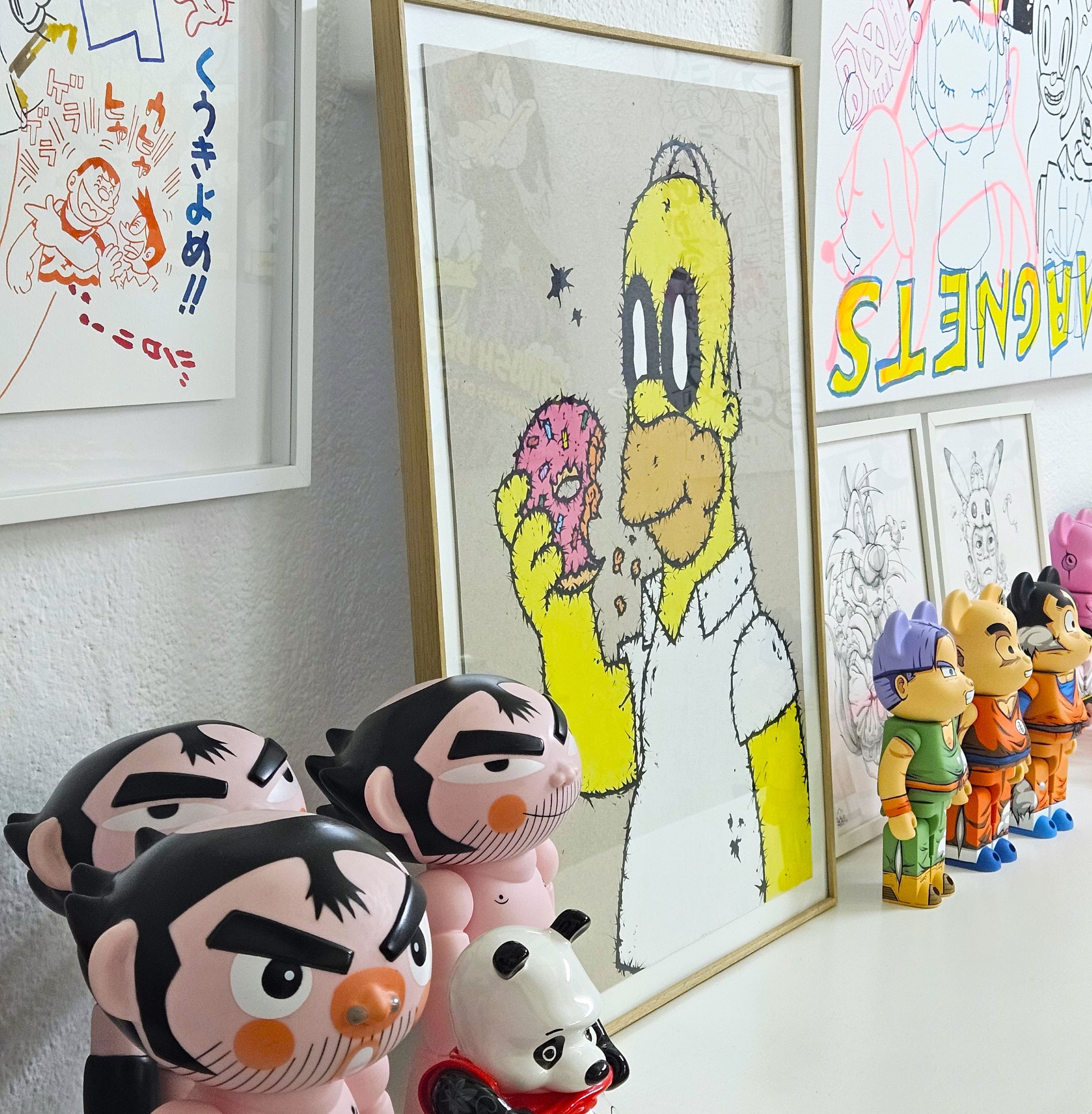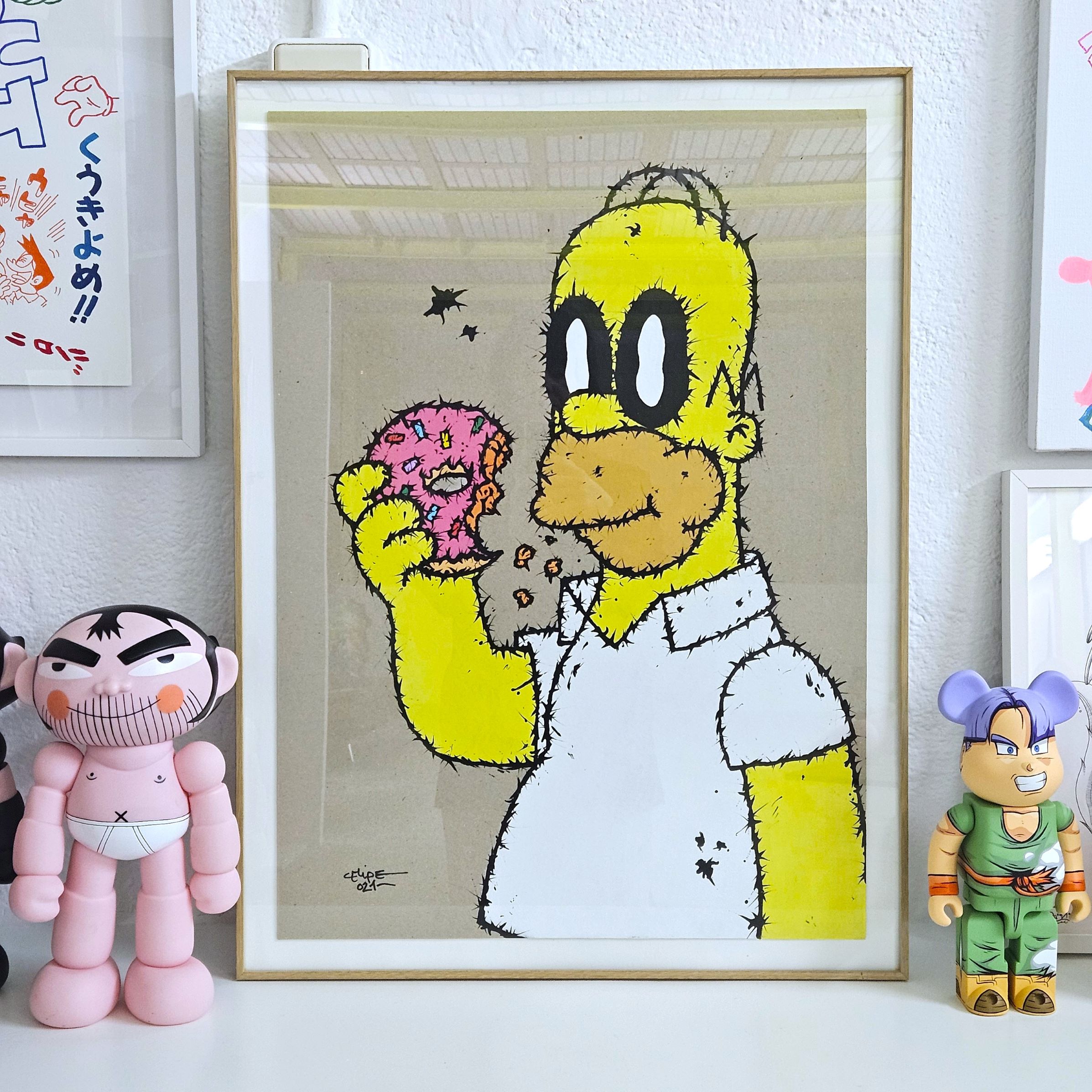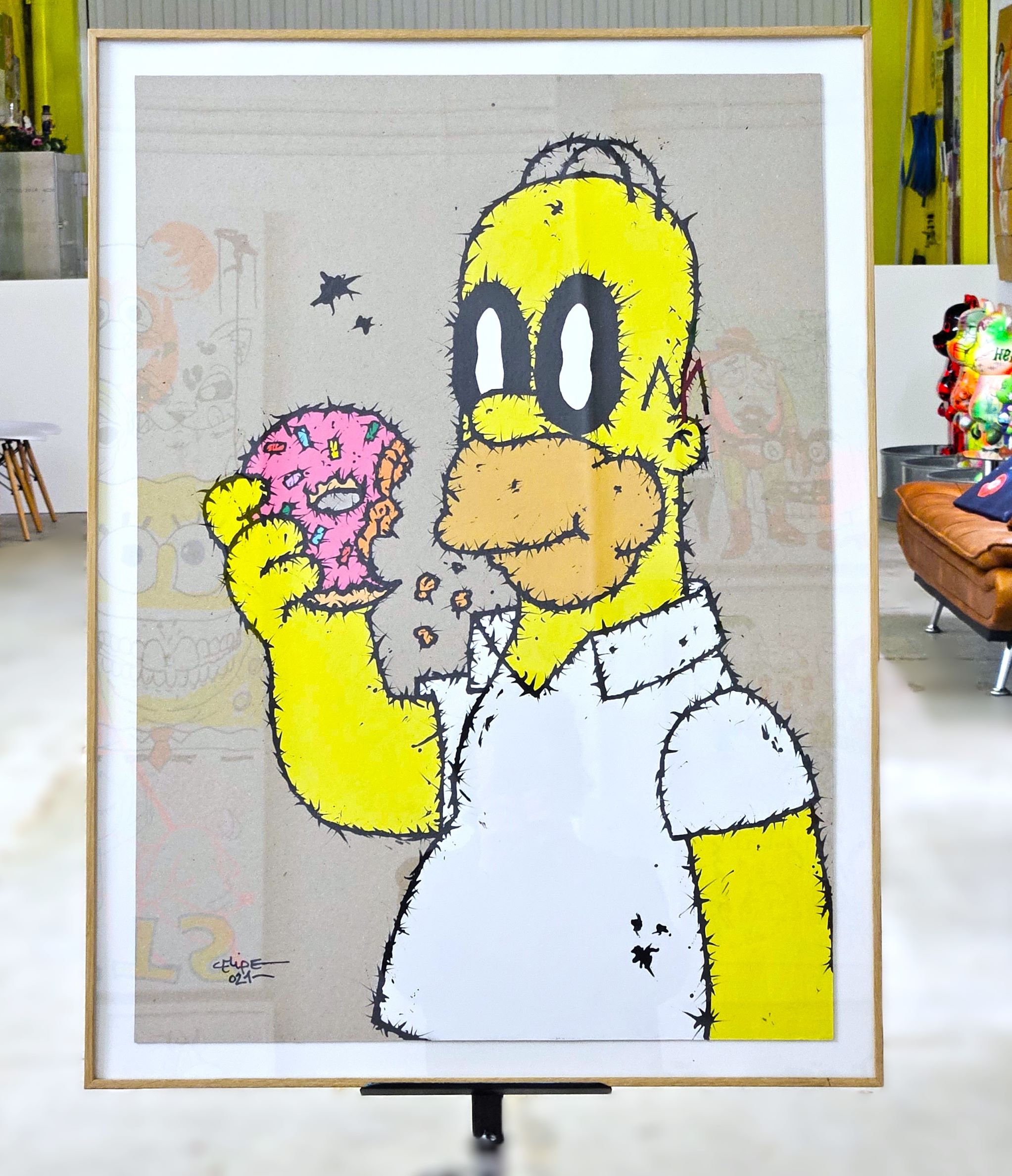 Celipe Perroloco uses Homer to speak about how we chase quick hits of gratification. A dop@mine rush to soothe stress or anxiety, even knowing the satisfaction will be brief… and that the emptiness will follow. This is Neo Pop at its purest: direct, ironic, and laced with a rawness that hides beneath a familiar icon.