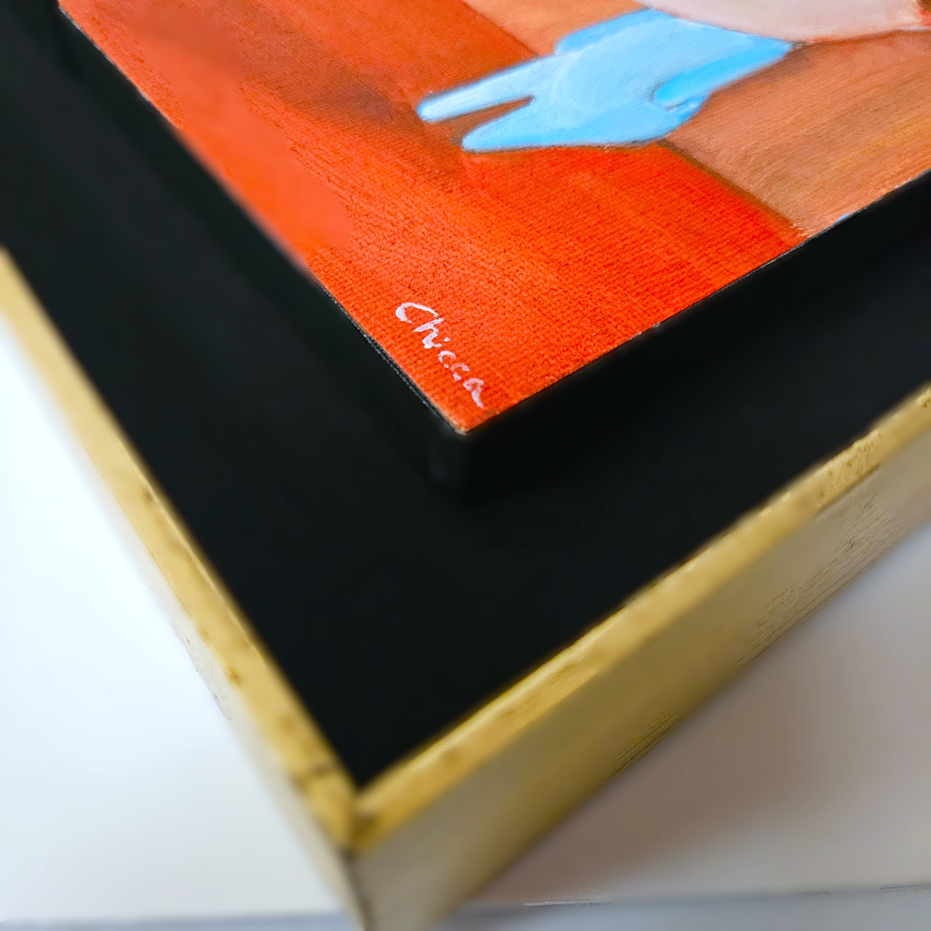 • The artwork is beautifully framed by professionals in a gold wooden frame, with a passe-partout background that enhances the composition.