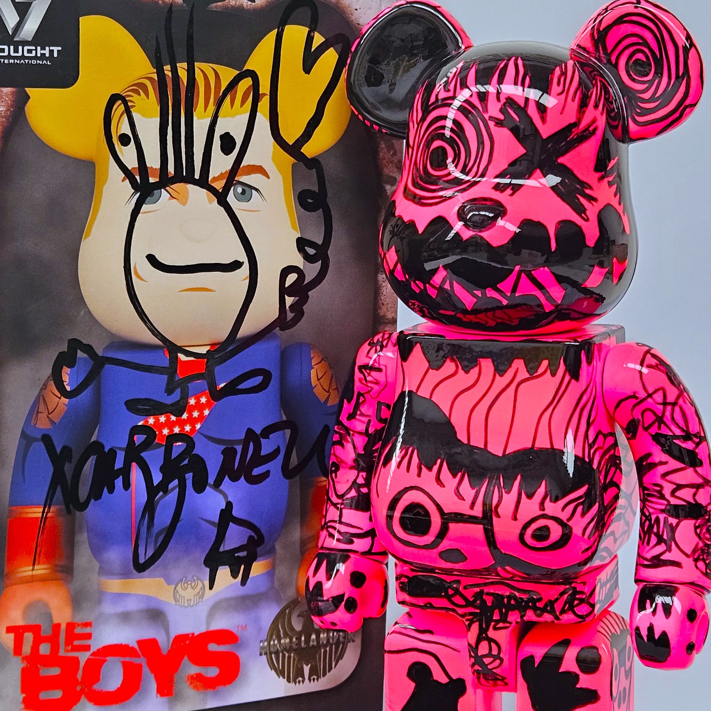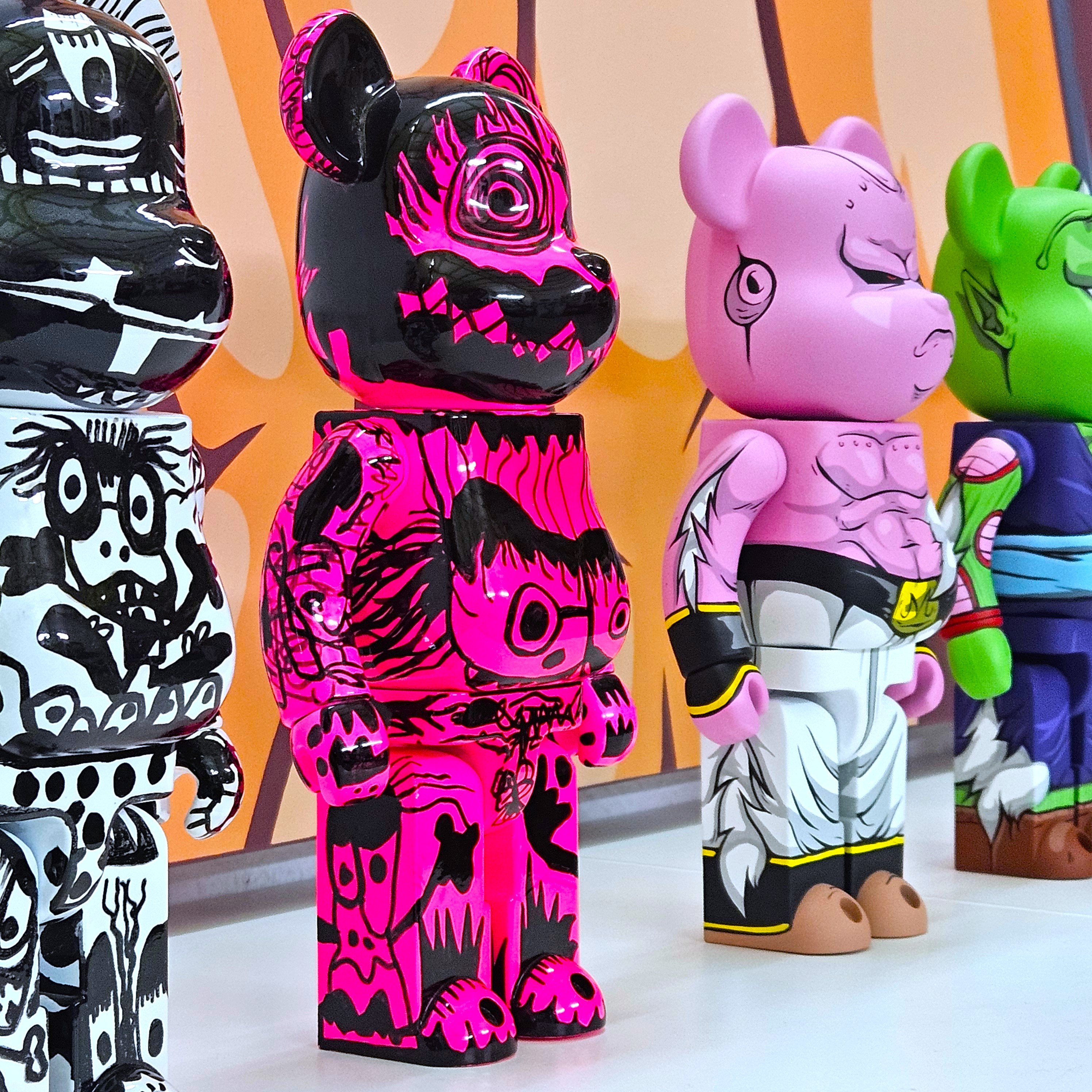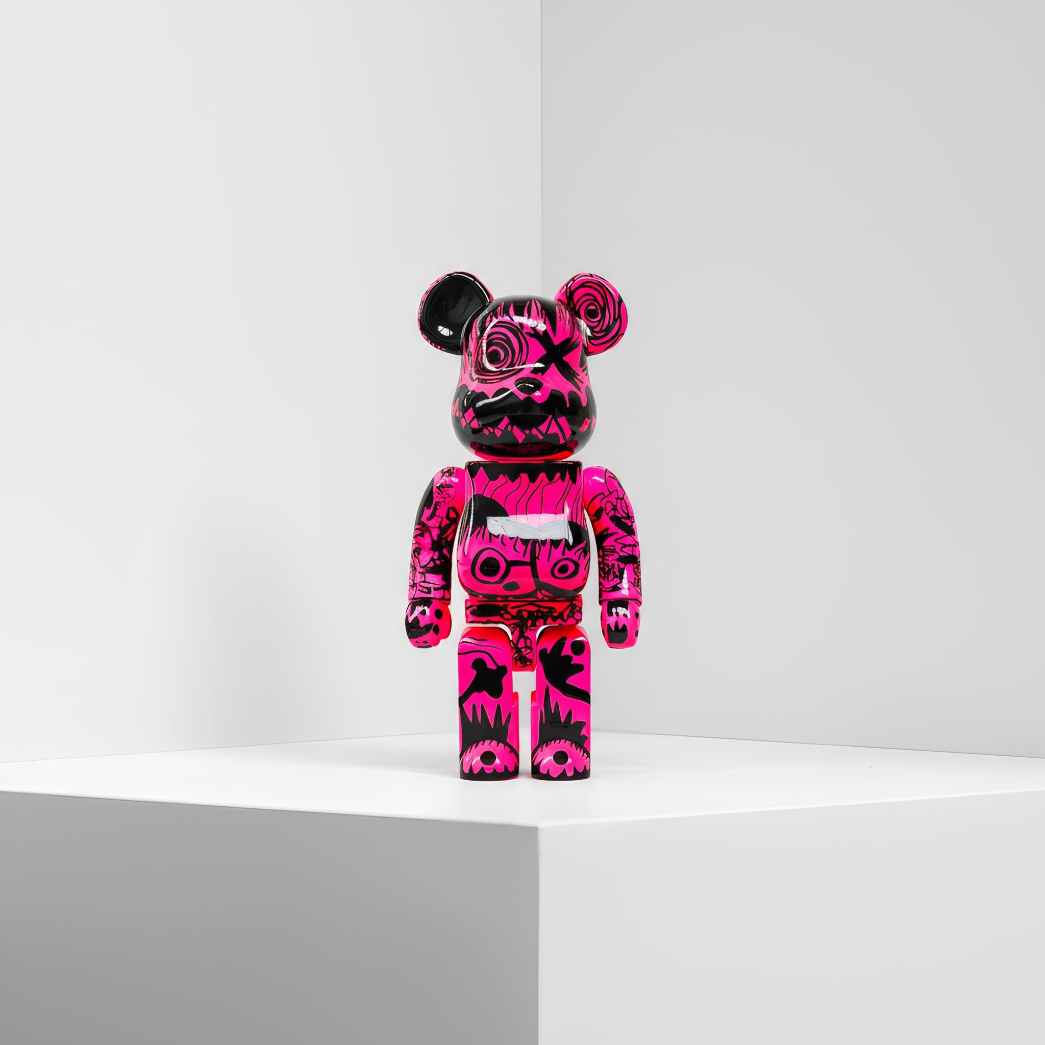 This Bearbrick screams. It screams with impulsive characters, with electric pink and glossy black coexisting in constant tension—like the remnants of childhood colliding with the impulses of adult consciousness. Everything in it vibrates: strokes run, overlap, play.