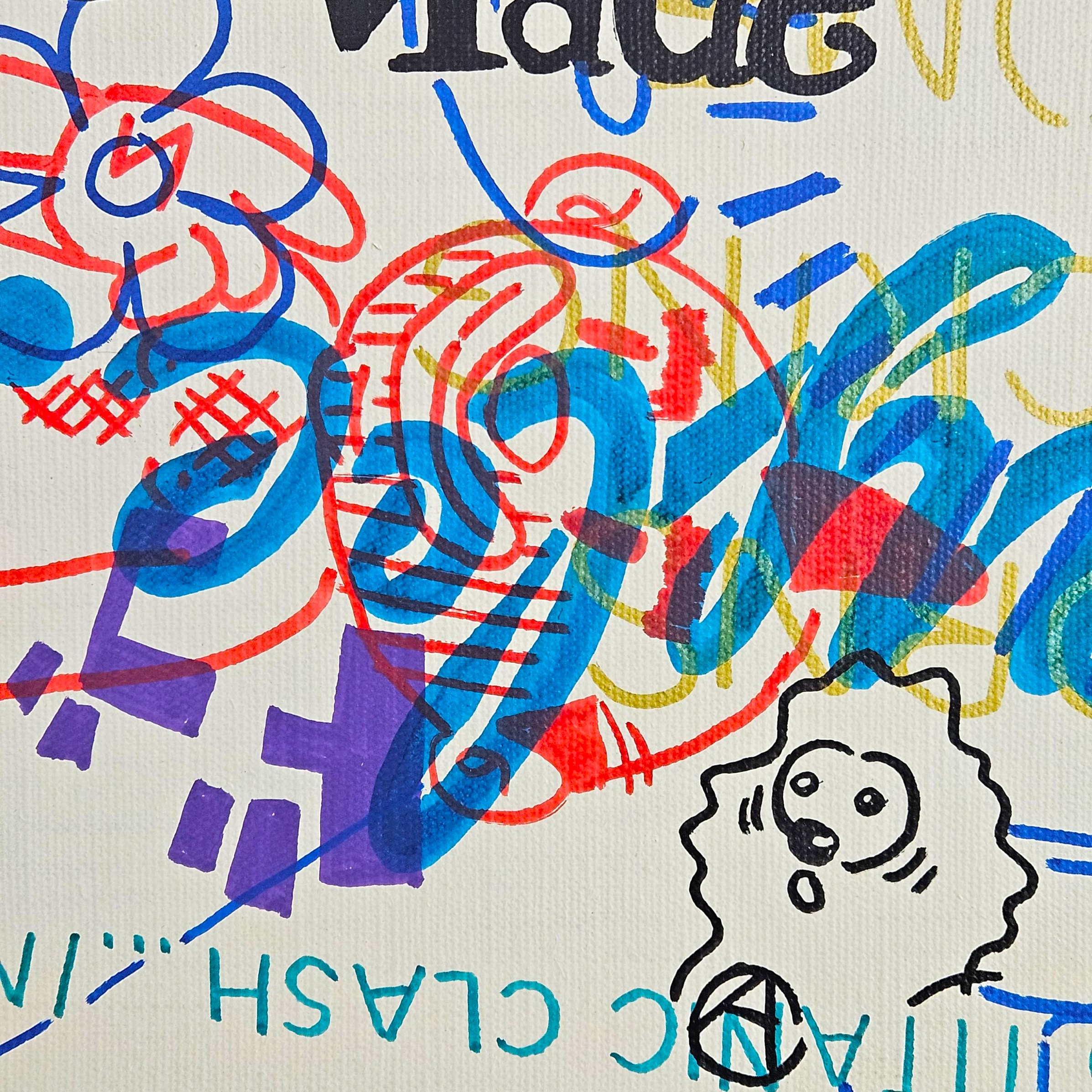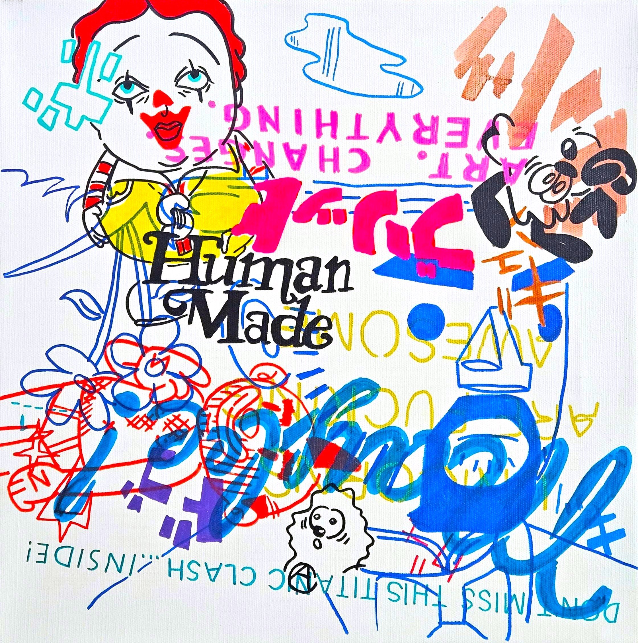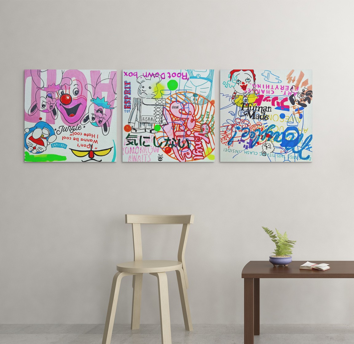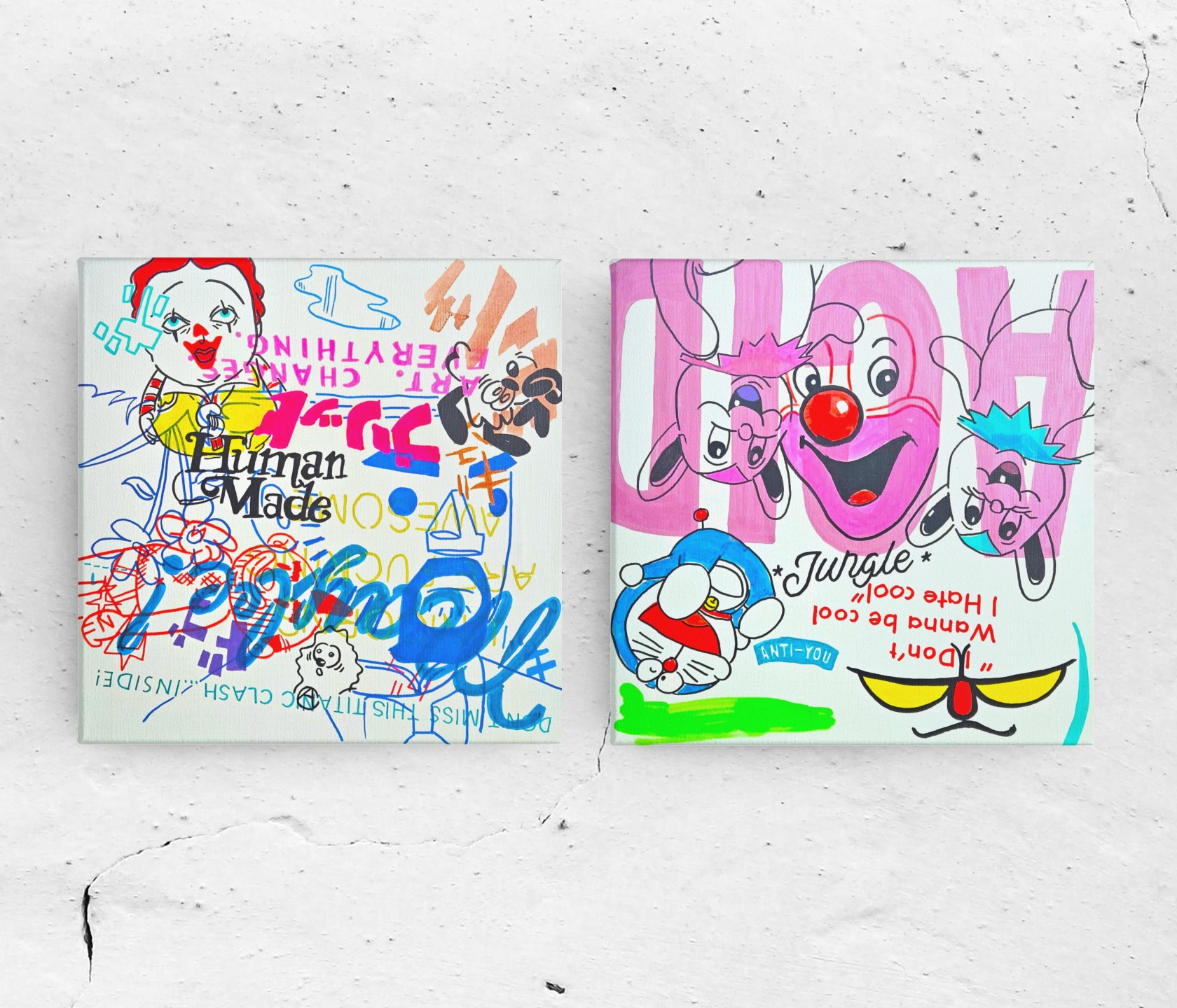 This piece doesn’t scream just to scream. It’s chaos with memory: the clown from your childhood (that now creeps you out a bit), unfinished manga lines, an out-of-control panda, fonts in full-on battle… and right in the middle of all that, you.