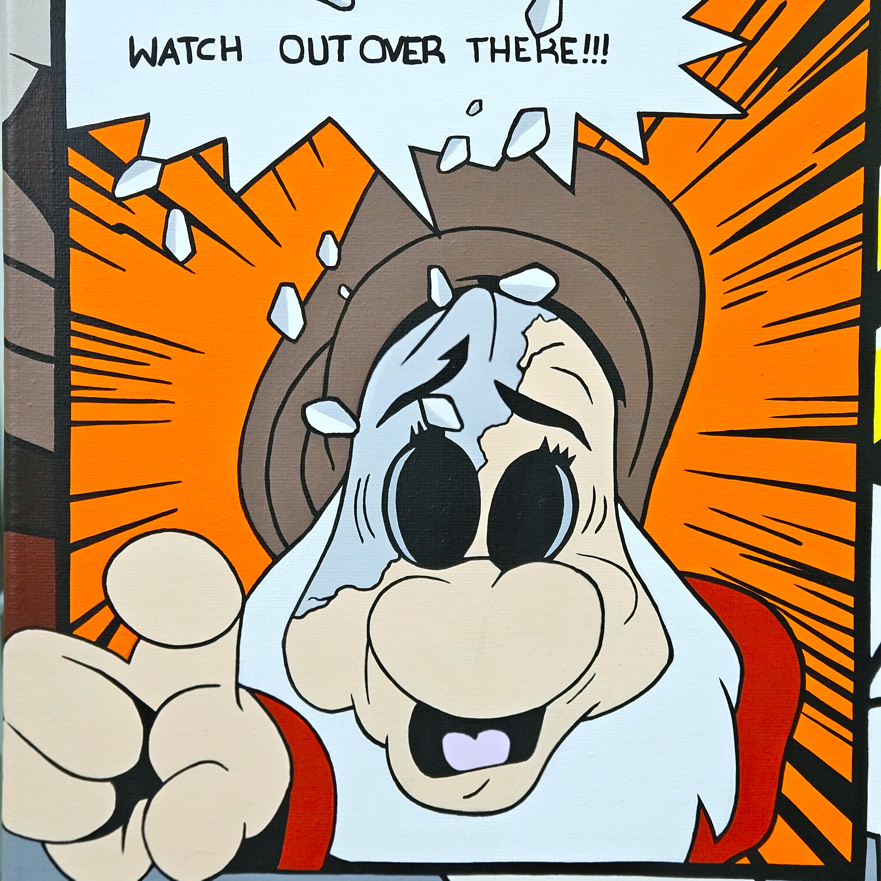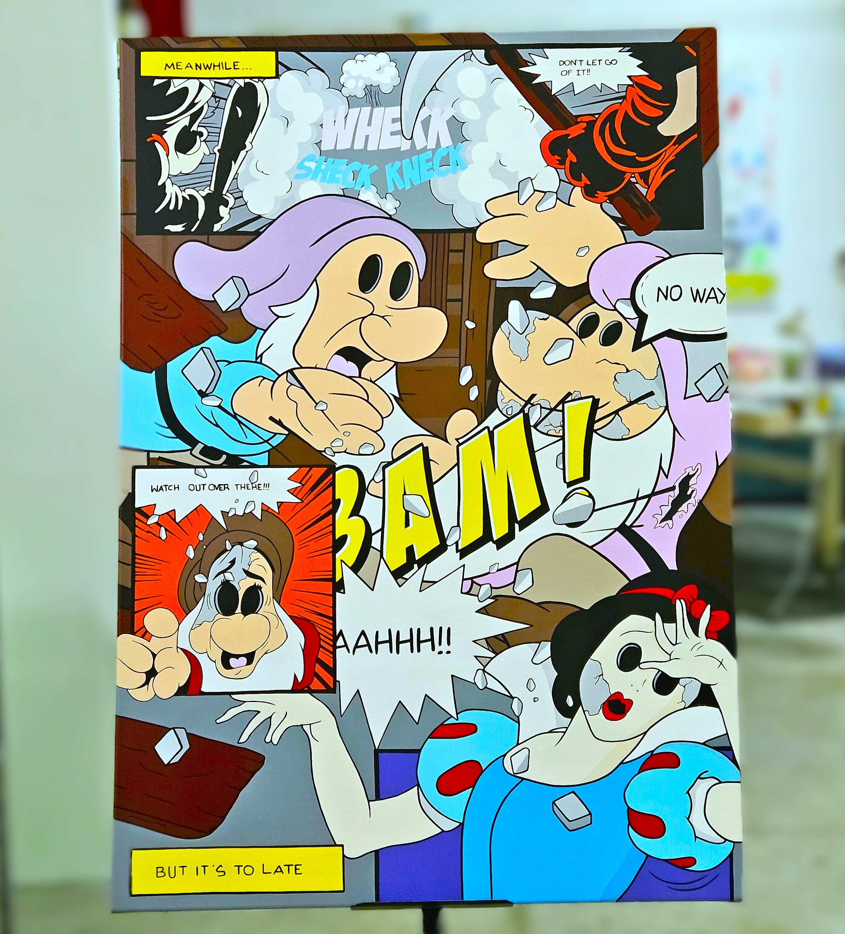 This artwork is a visual scream that shatters the calm. Fragments, action, and drama collide in a composition that feels ripped straight from a comic panel.