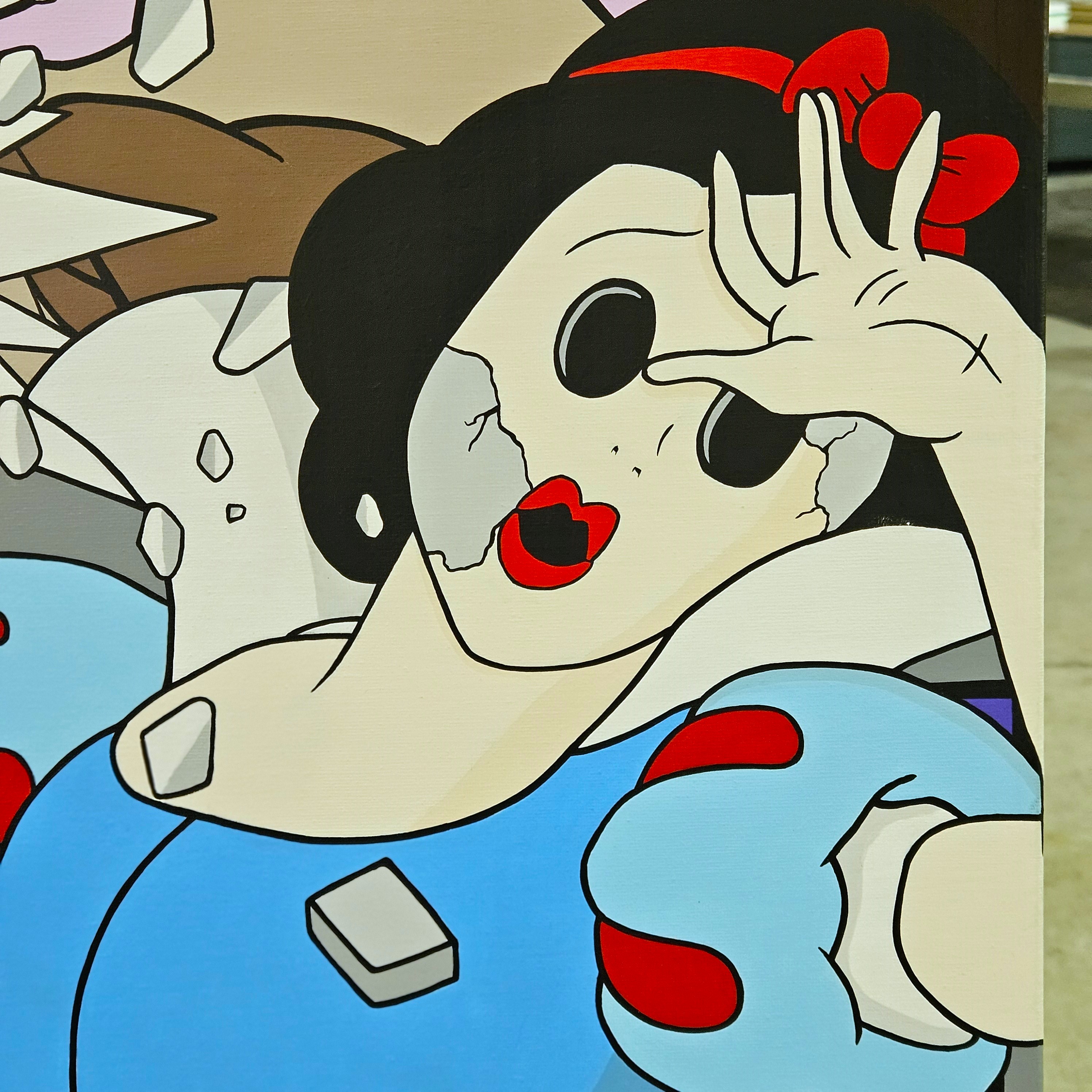 CAZXU (Germany) moves between Urban Art, Neo Pop, and Pop Surrealism, creating works filled with gestures and symbols that speak of modern life with a Pop irony that defines both her characters and her aesthetic. Her style combines bold strokes, vibrant colors, and fragments of popular culture that the viewer reconstructs like pieces of an emotional puzzle.
