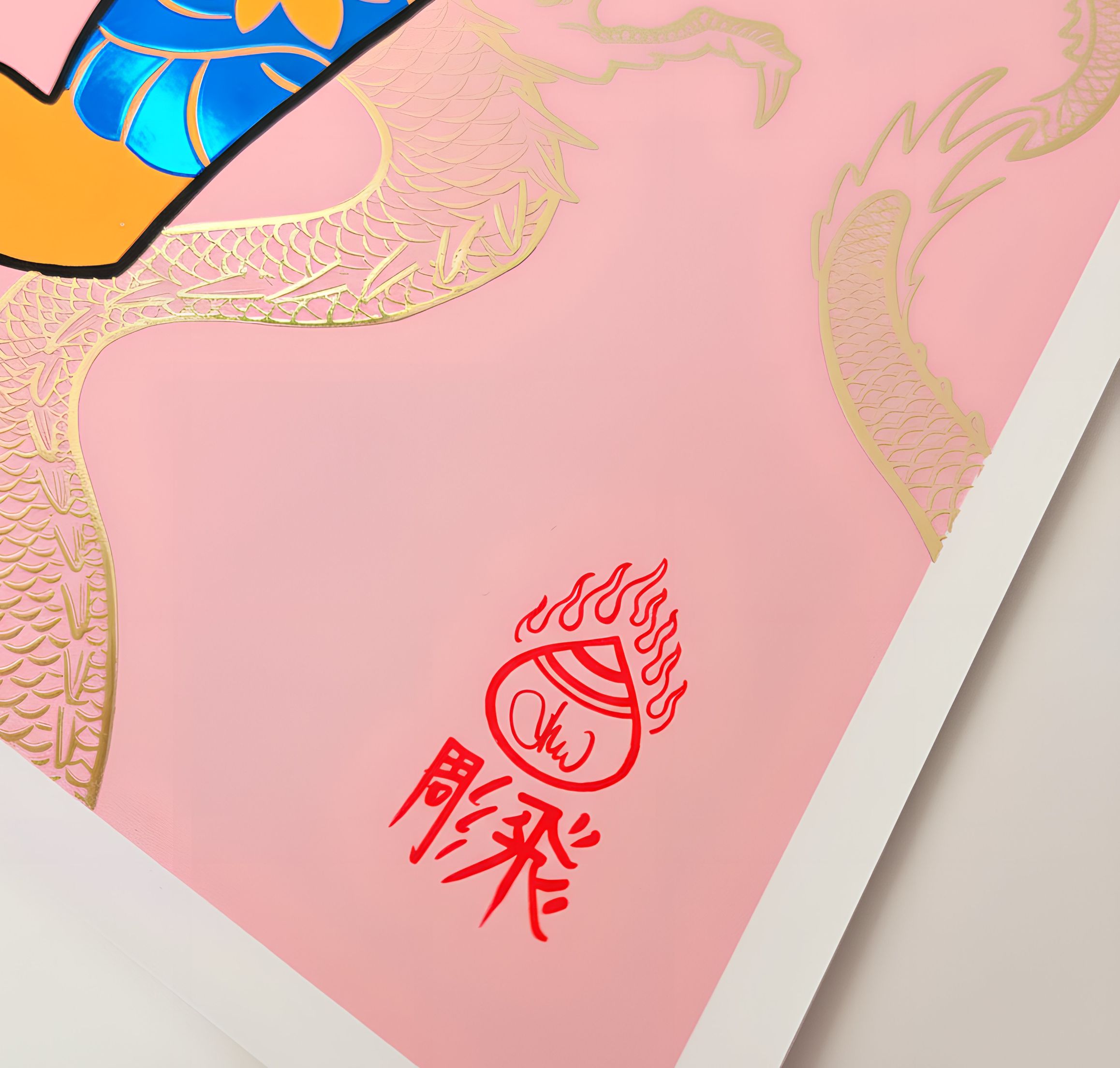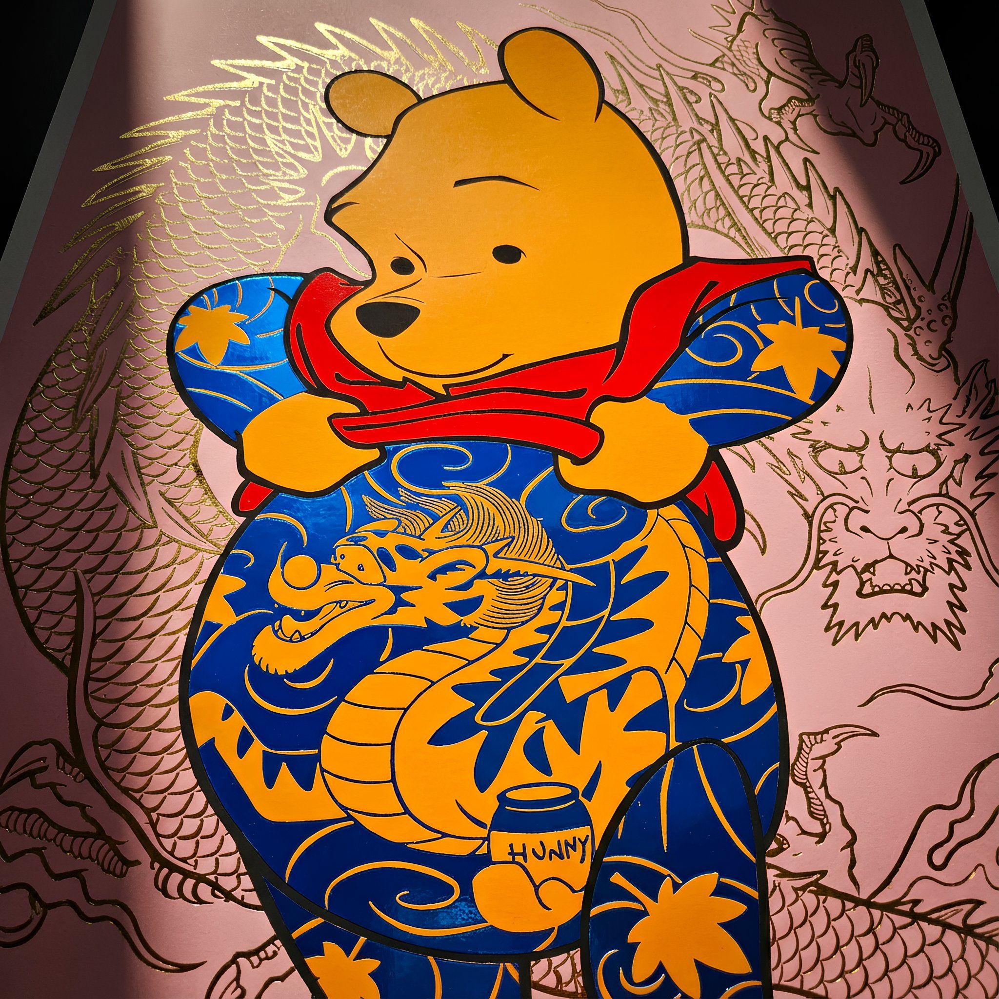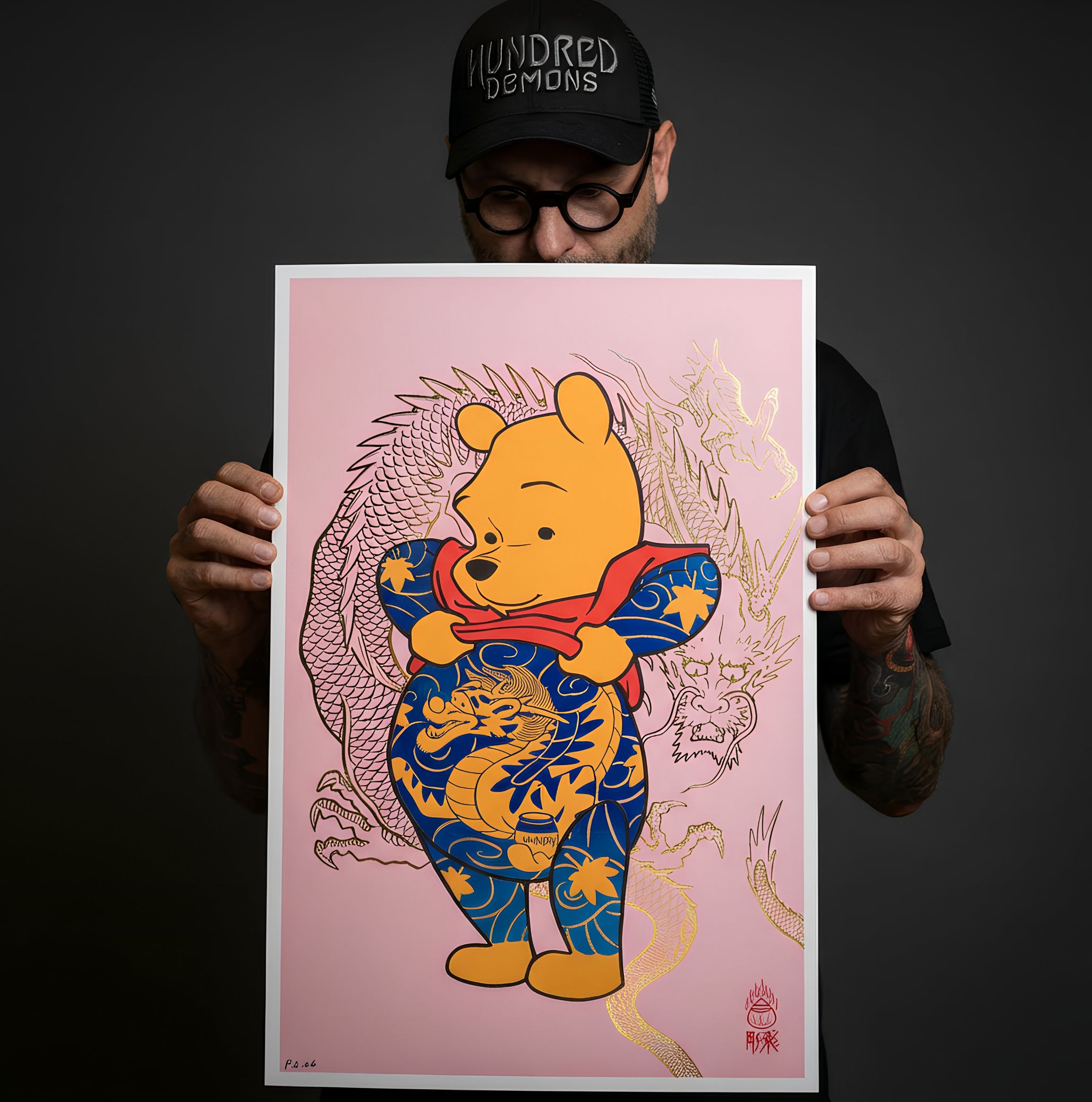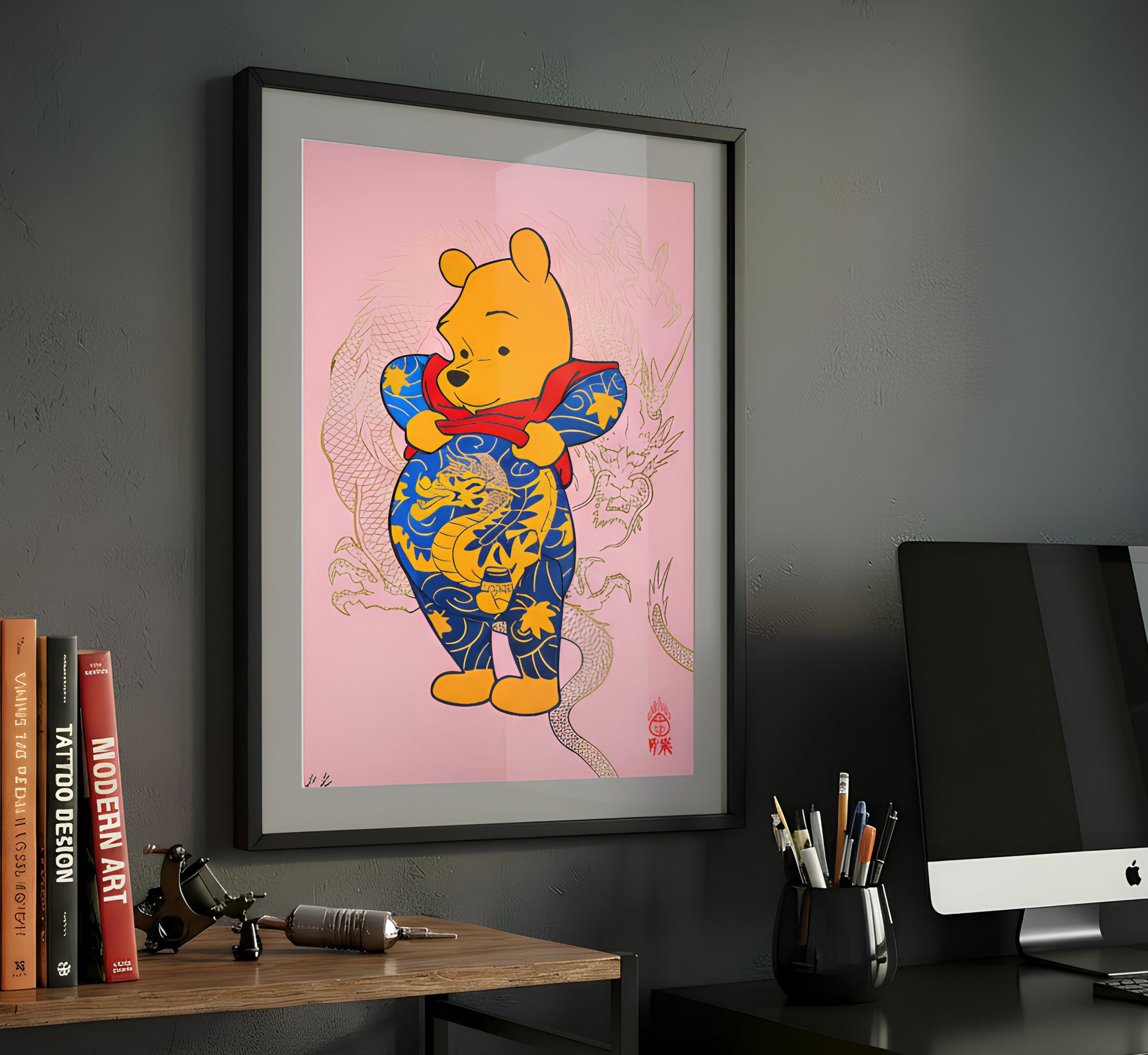 Inspired by traditional Japanese tattooing, this print transforms a childhood icon into a figure that faces adulthood head-on. With humor, with memory, with identity. The color says it all: gold, blue, red. No shadows. No soft tones. Like a tattoo that never fades.