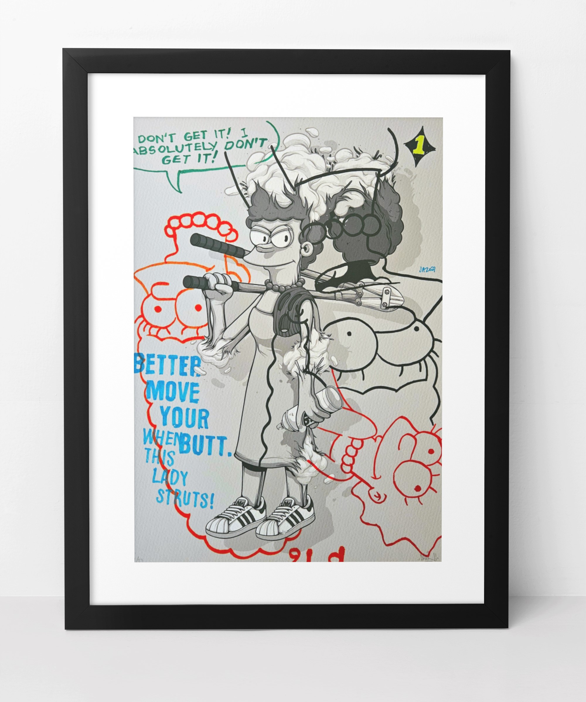 You’re looking at the only print from the limited series “Deconstructed Marge” (33 black-and-white prints) by Dhani, hand-painted by Judas Arrieta.