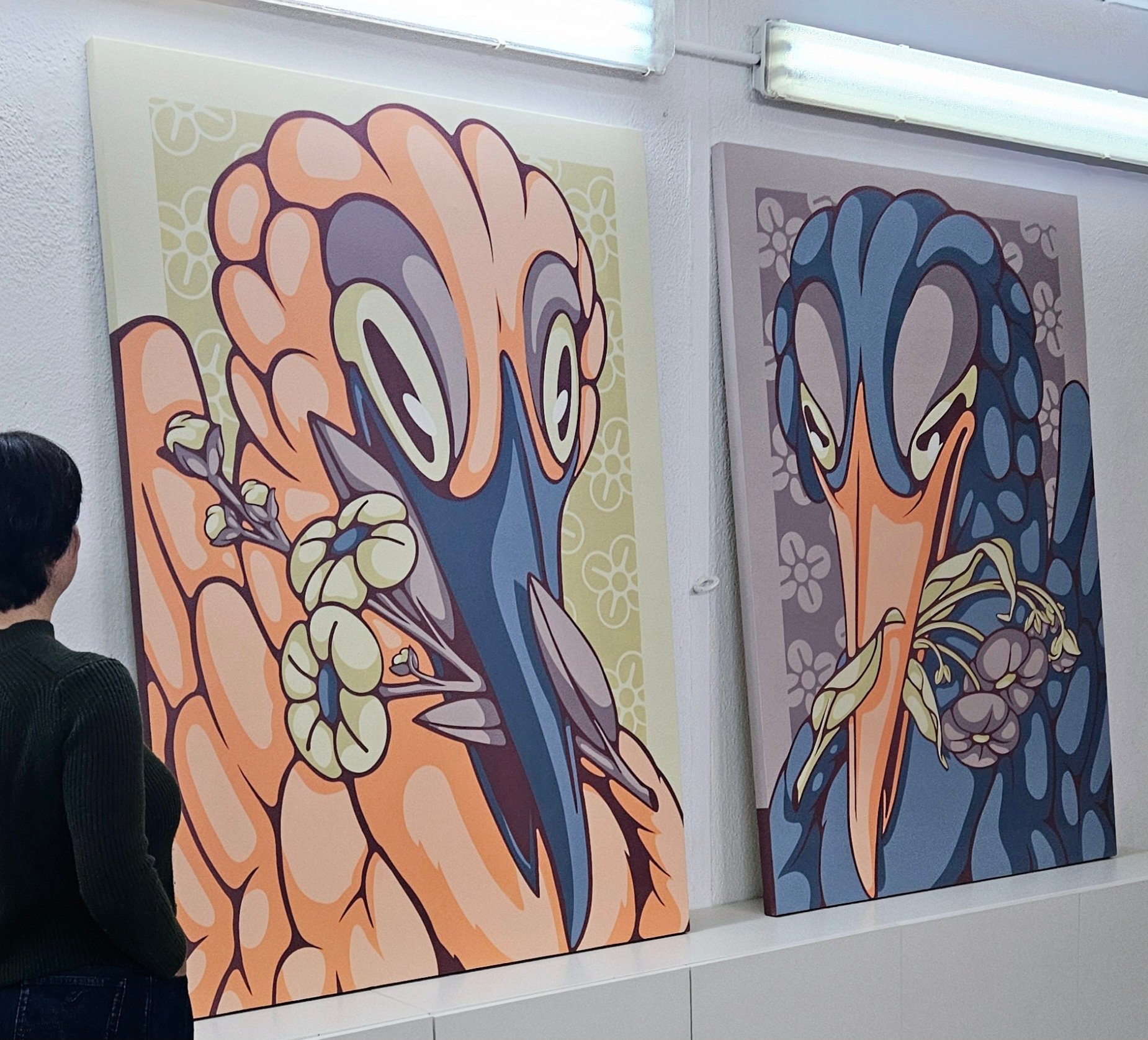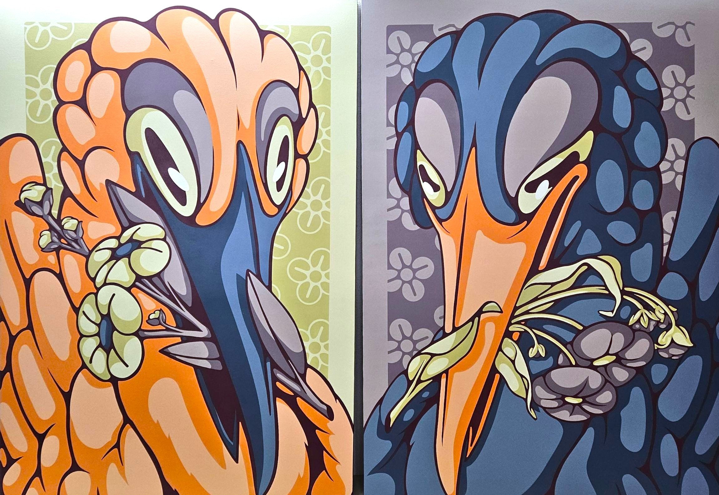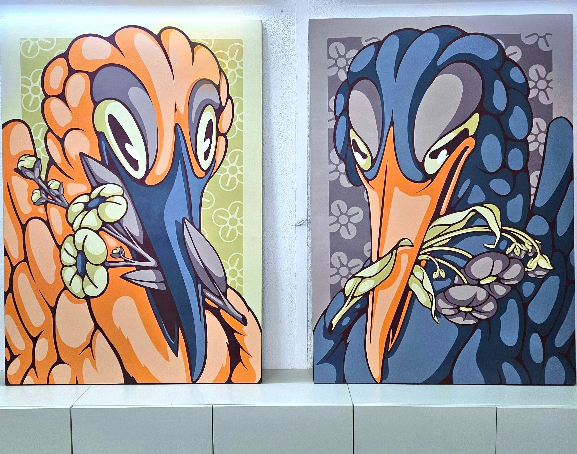 This diptych presents a visual conversation between purity and decay, between blooming and withering. Each brushstroke and layer of spray paint reveals the fears and triumphs that accompany the creative process, as if emotions took shape in feathers and flowers.
