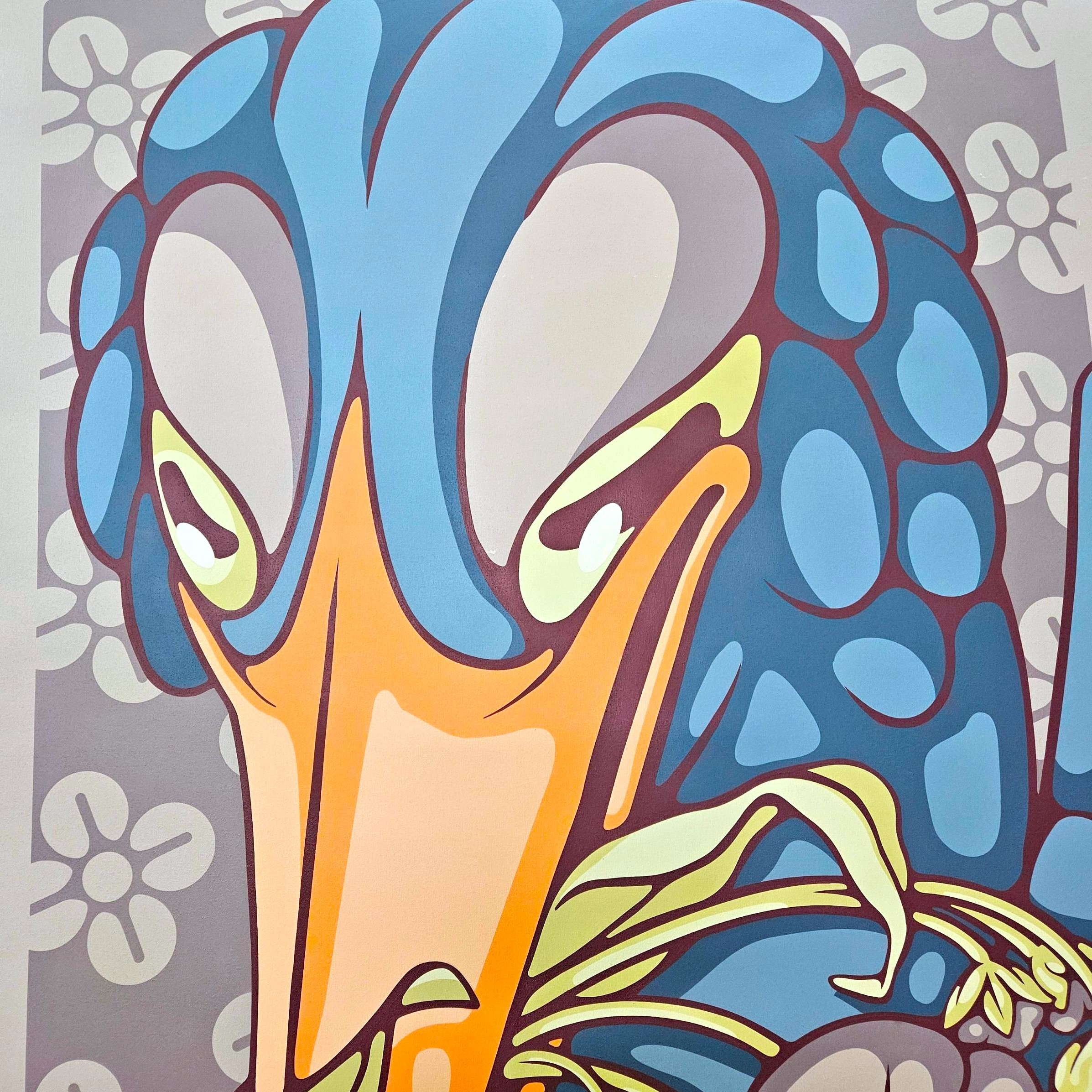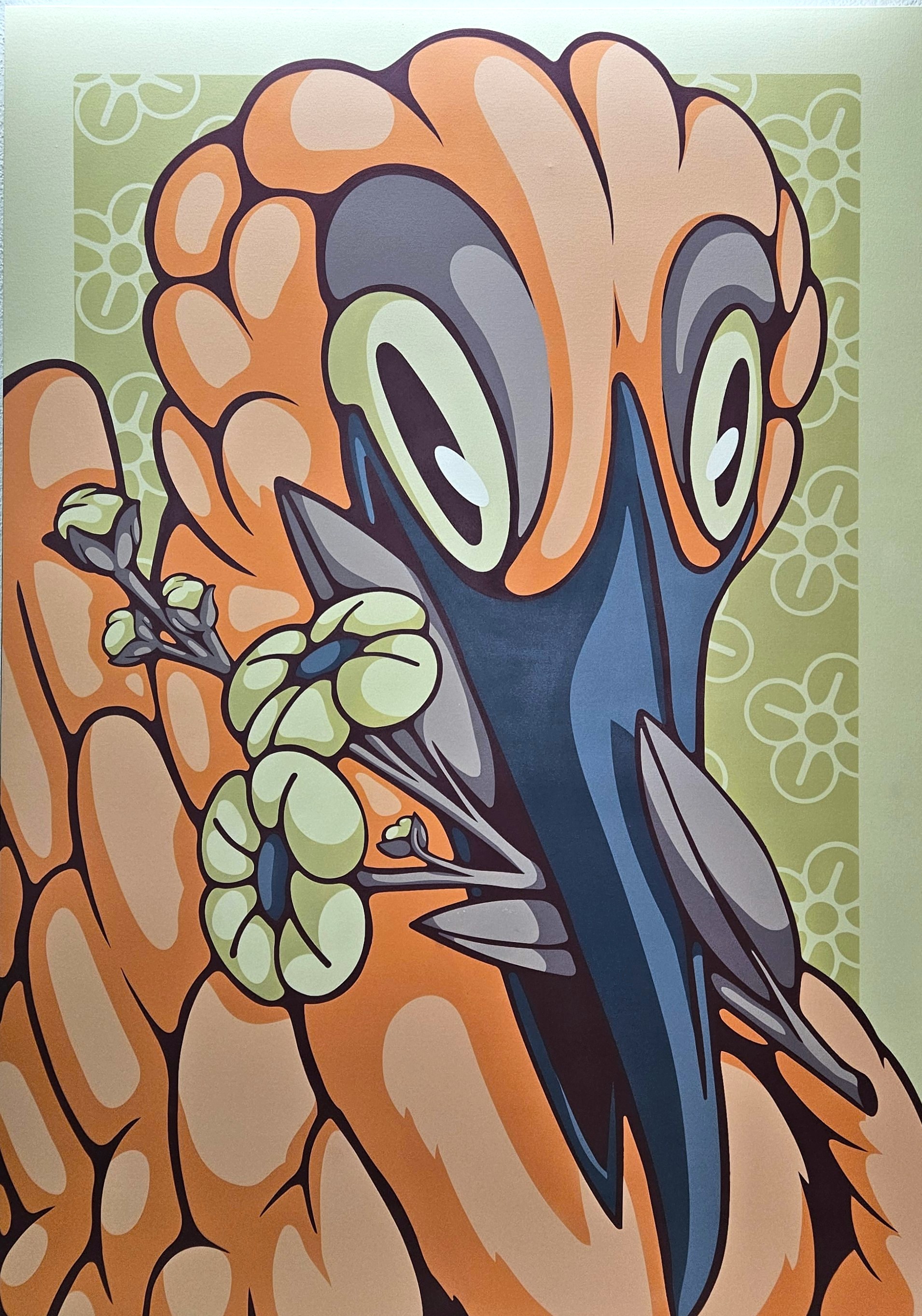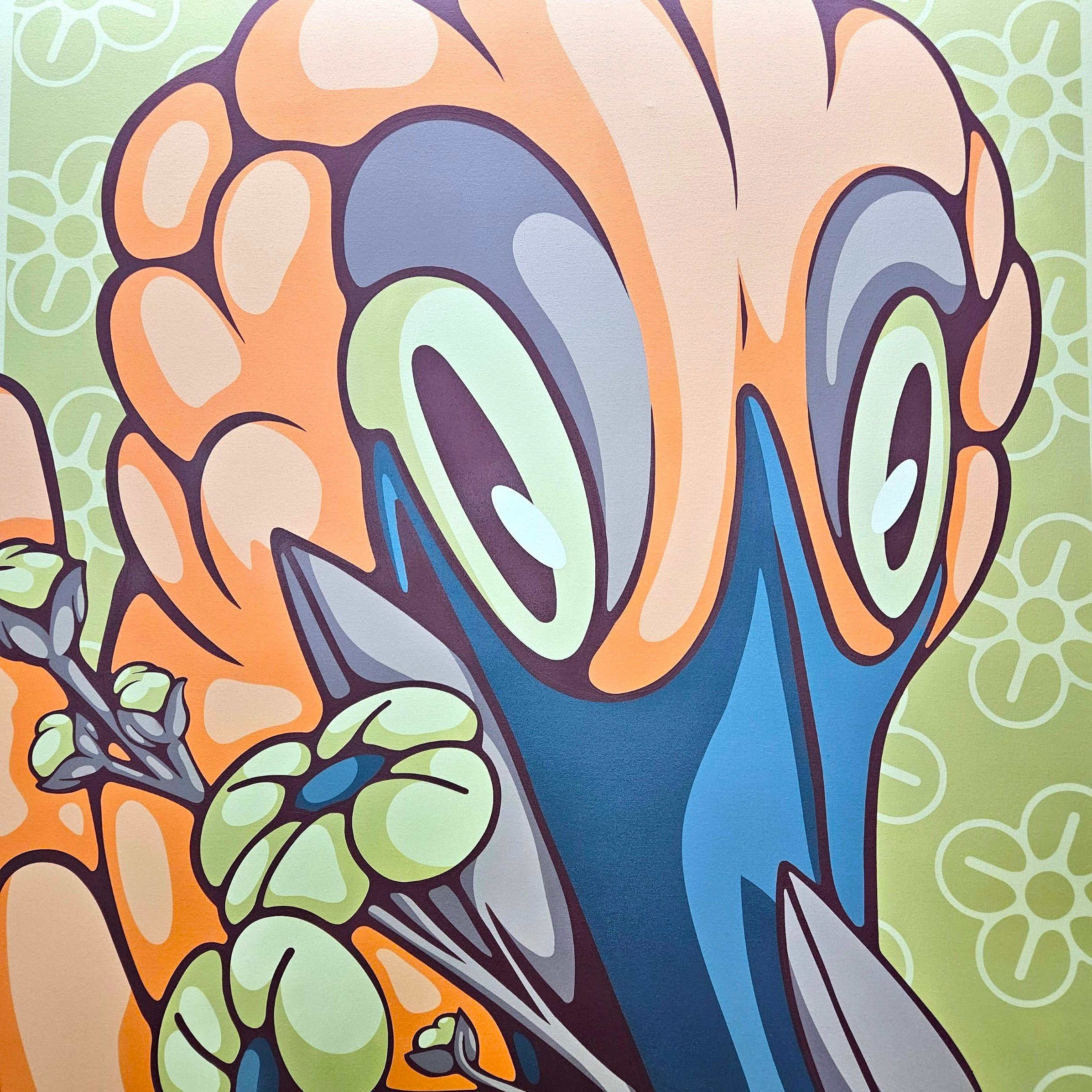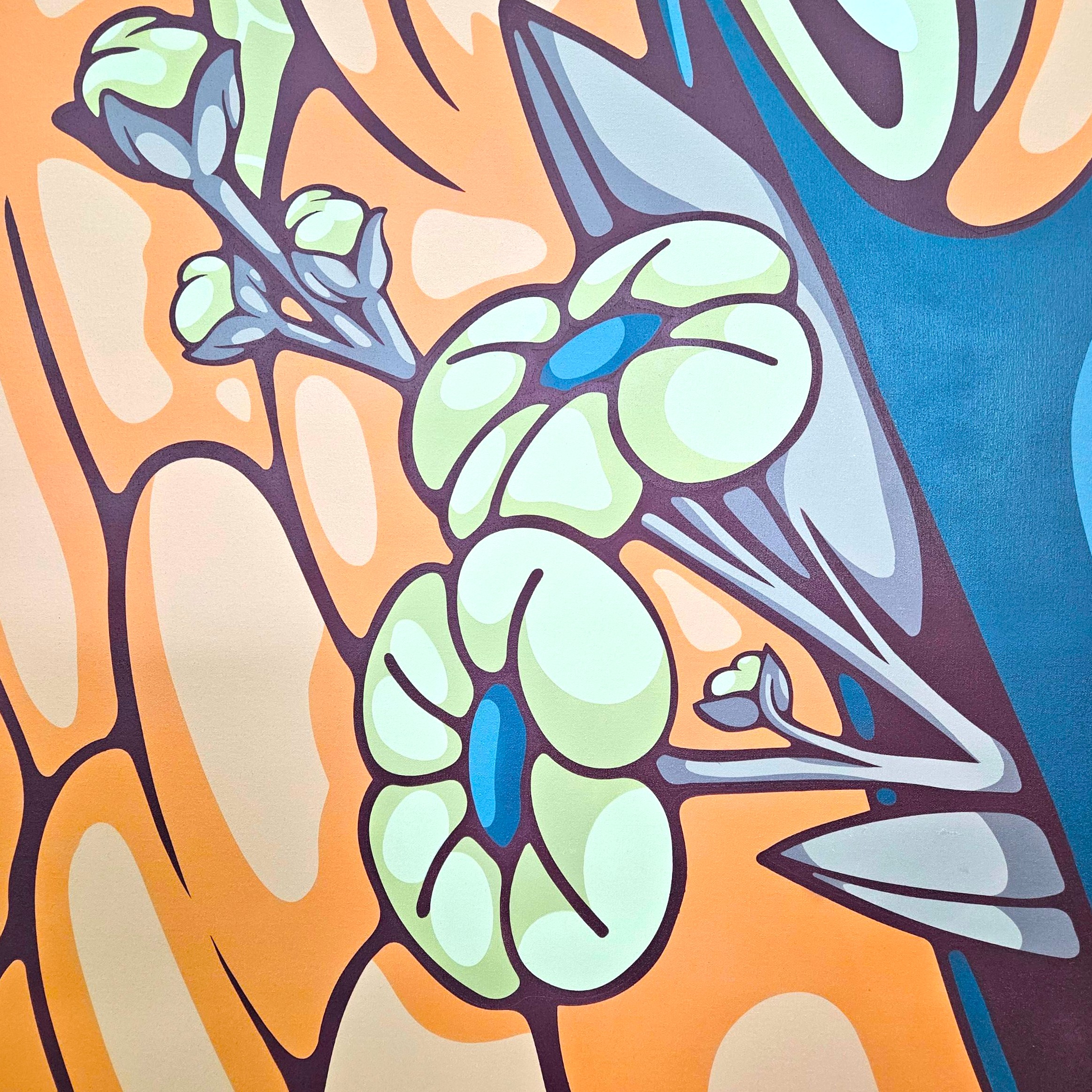 This diptych presents a visual conversation between purity and decay, between blooming and withering. Each brushstroke and layer of spray paint reveals the fears and triumphs that accompany the creative process, as if emotions took shape in feathers and flowers.