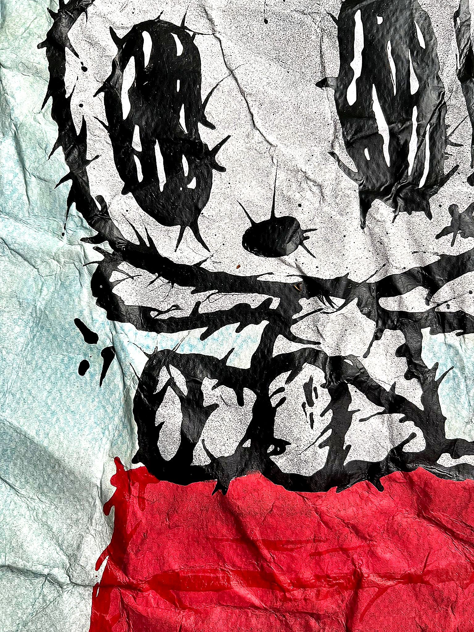 His work balances simplicity and complexity, reflecting the human duality between light and shadow, restraint and energy. Through painting, illustration, and design, Célipe invites reflection on what we reveal and conceal, showcasing his bold approach and ability to turn humble materials into pieces that inspire and provoke.