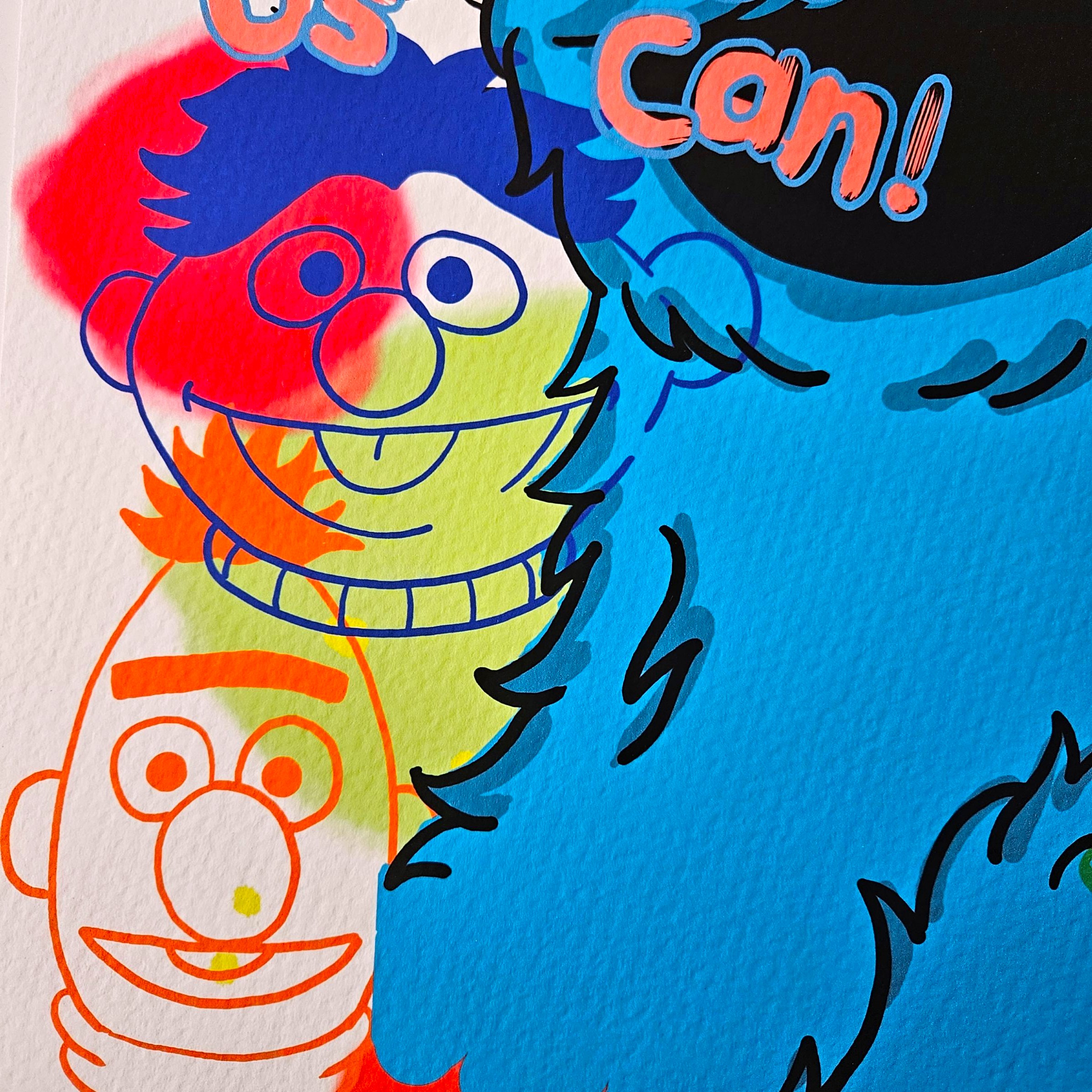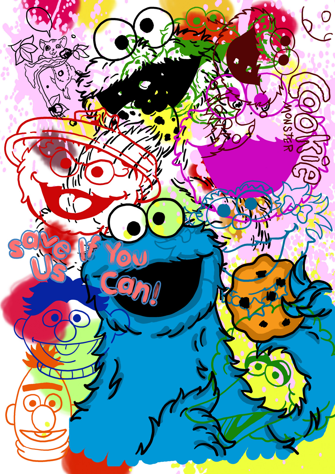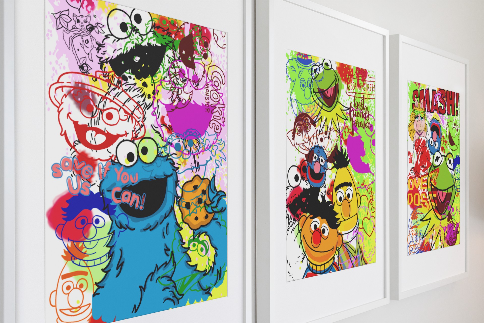 Cookie Monster. Bert and Ernie. Grover. Rosita. Big Bird…All of them here — distorted, overflowing — like a psychedelic dream spiraling out of control.