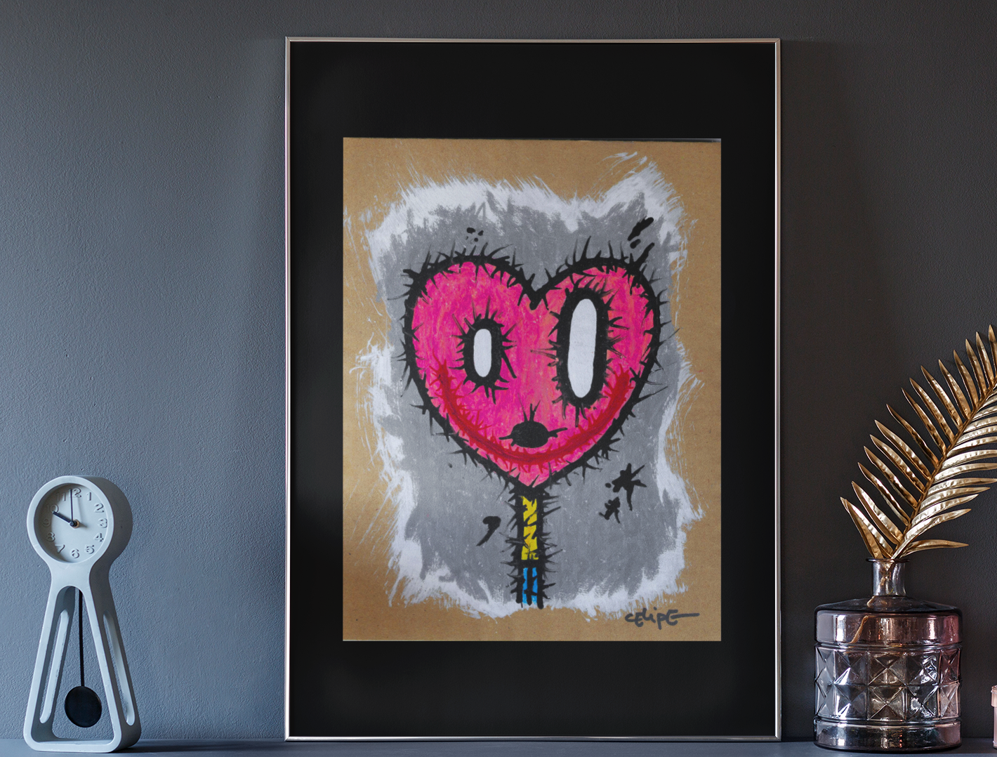 His work balances simplicity and complexity, reflecting the human duality between light and shadow, restraint and energy. Through painting, illustration, and design, Célipe invites reflection on what we reveal and conceal, showcasing his bold approach and ability to turn humble materials into pieces that inspire and provoke.