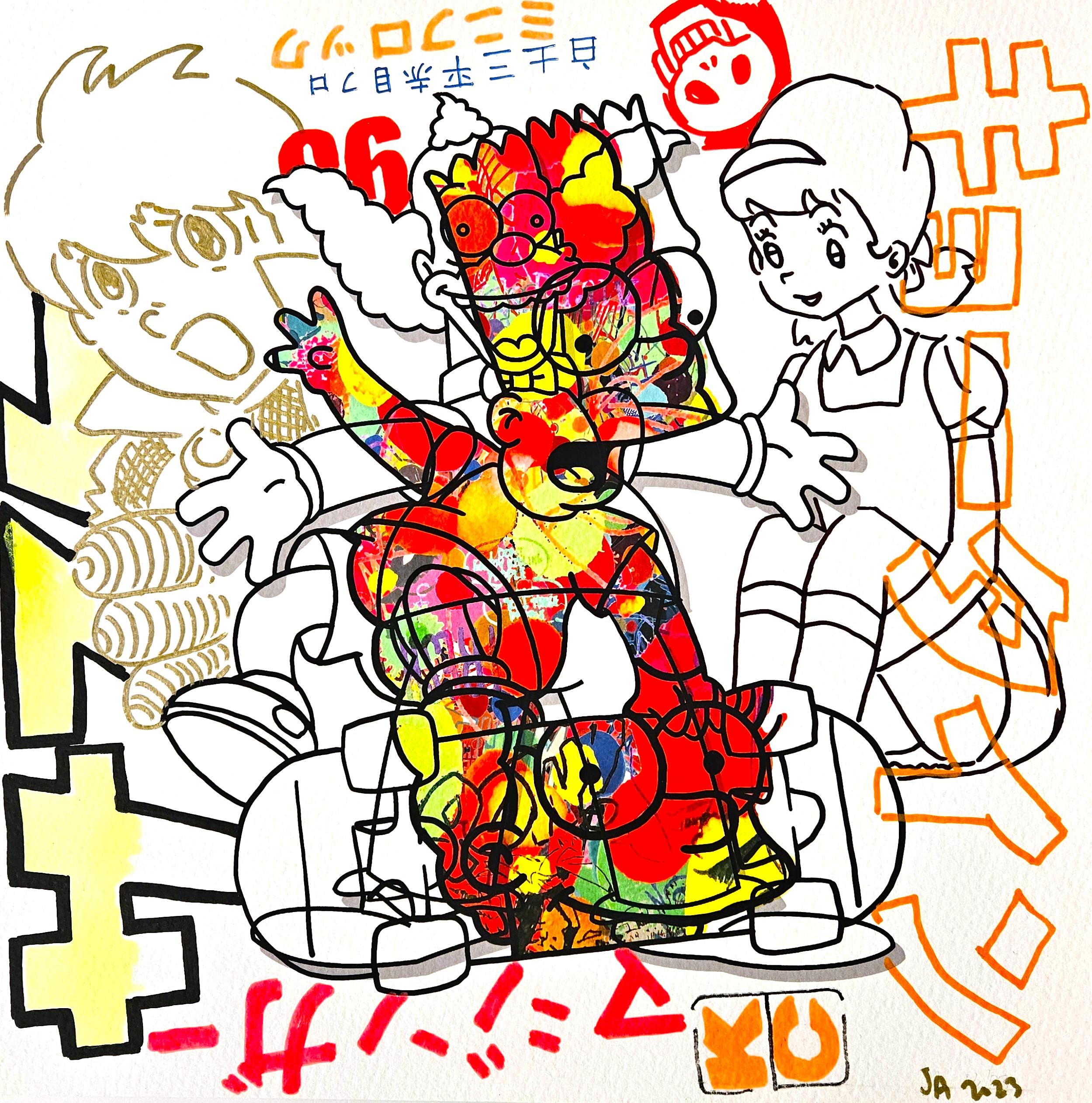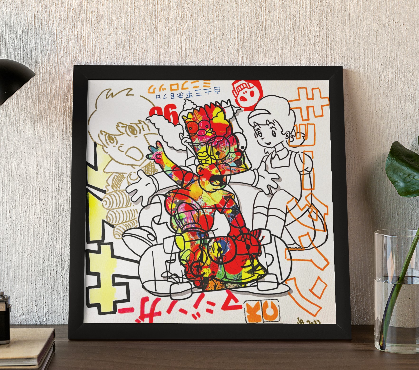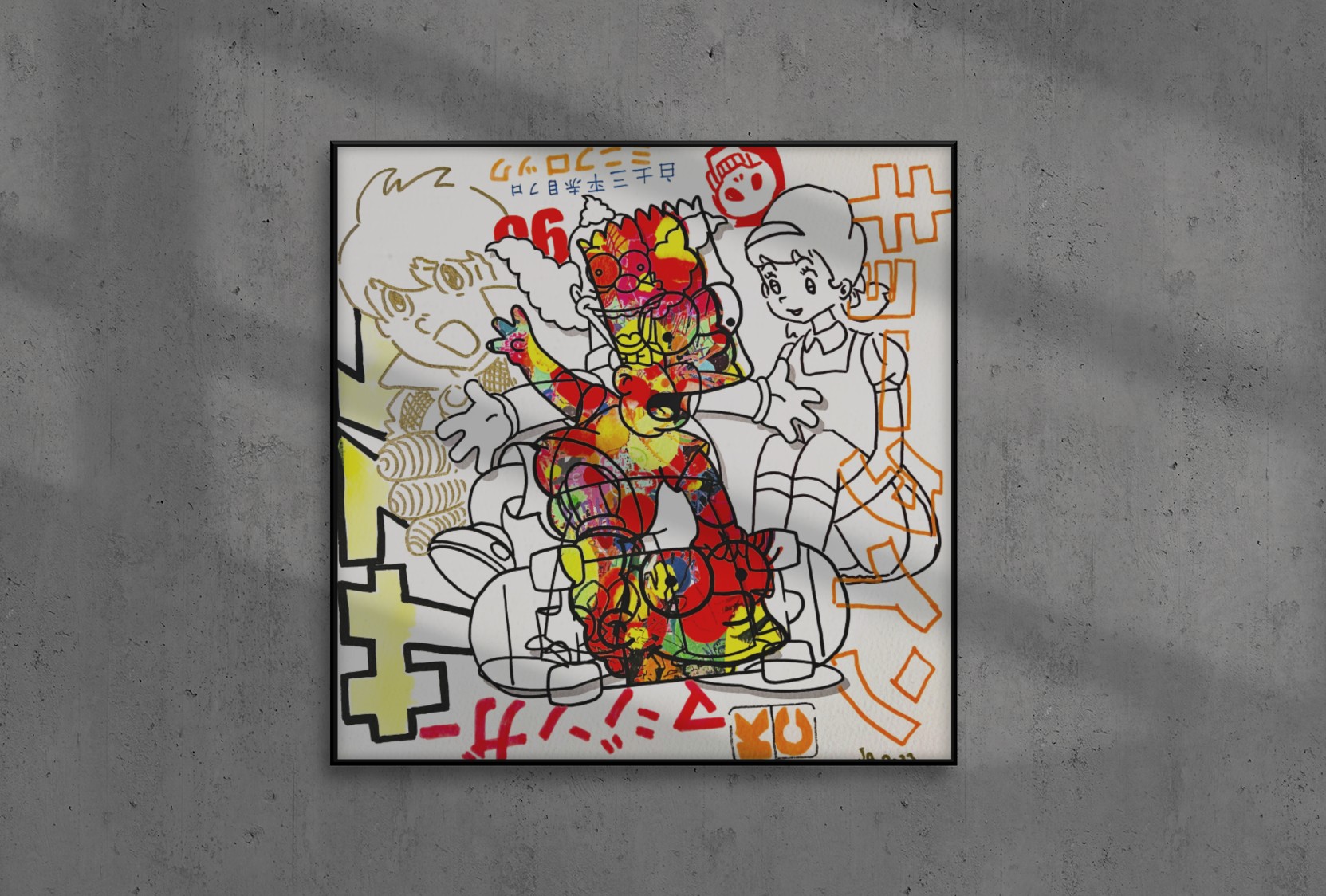 Nothing here stands still. Clashing lines, exploding colors, a whirlwind of manga, anime, and street art references. The past isn’t forgotten—it’s reinvented. Like a trick on the pavement, like graffiti on an impossible wall.