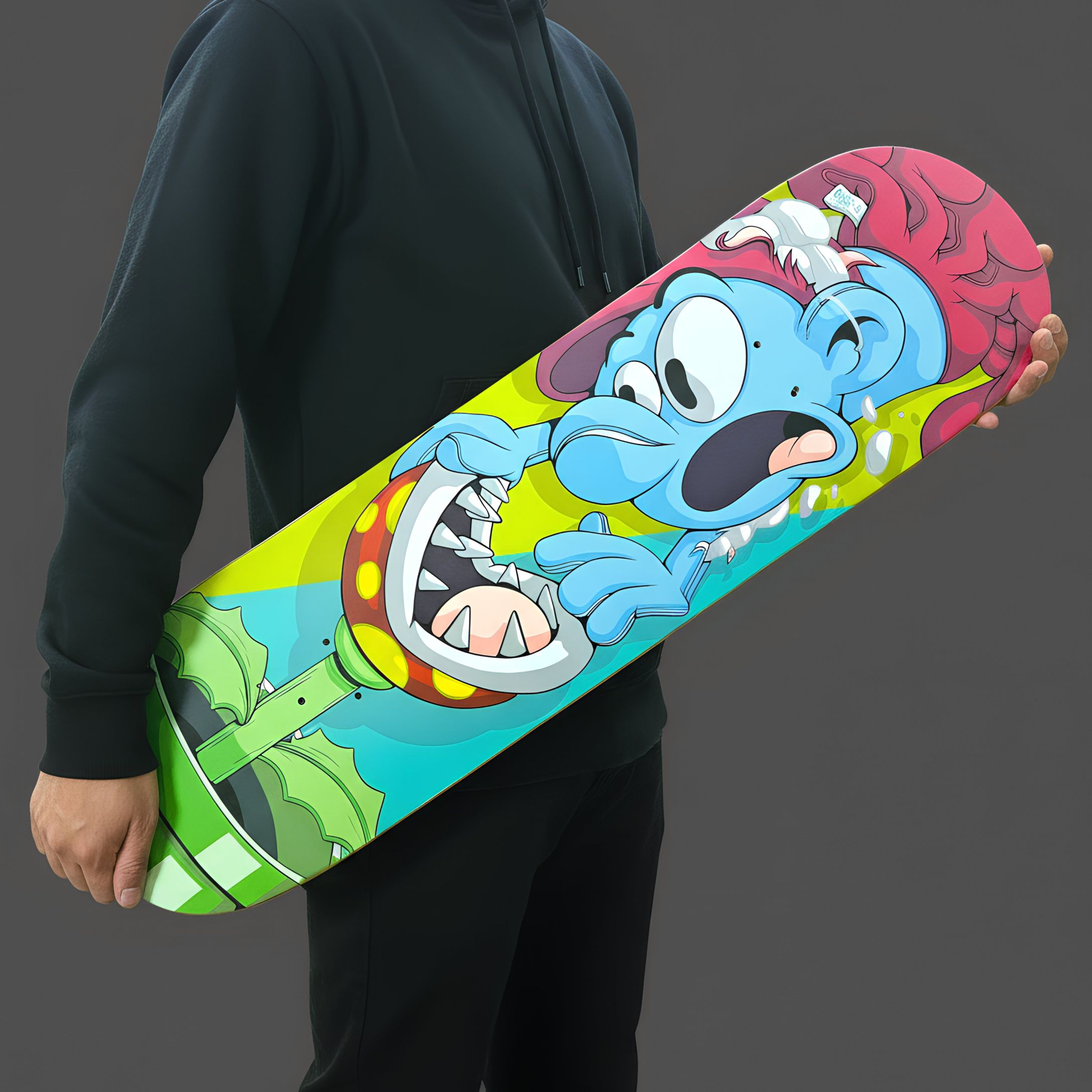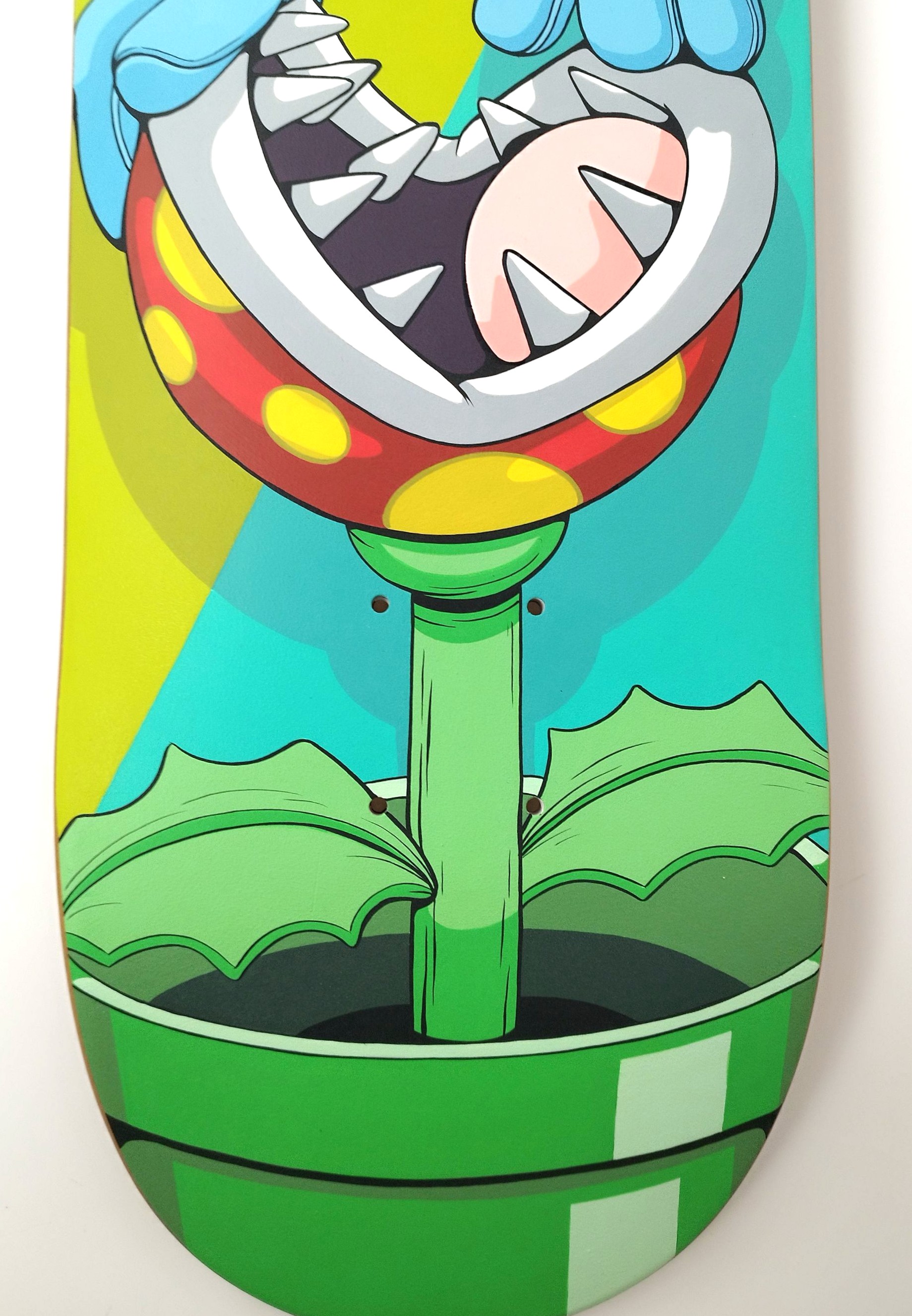 Chaos, color, and pop culture collide on this deck. Nat Smurfling rolled into the wrong spot, and the Piranha Plant is here to remind him of what every skater knows: the streets don’t forgive—move or get eaten.