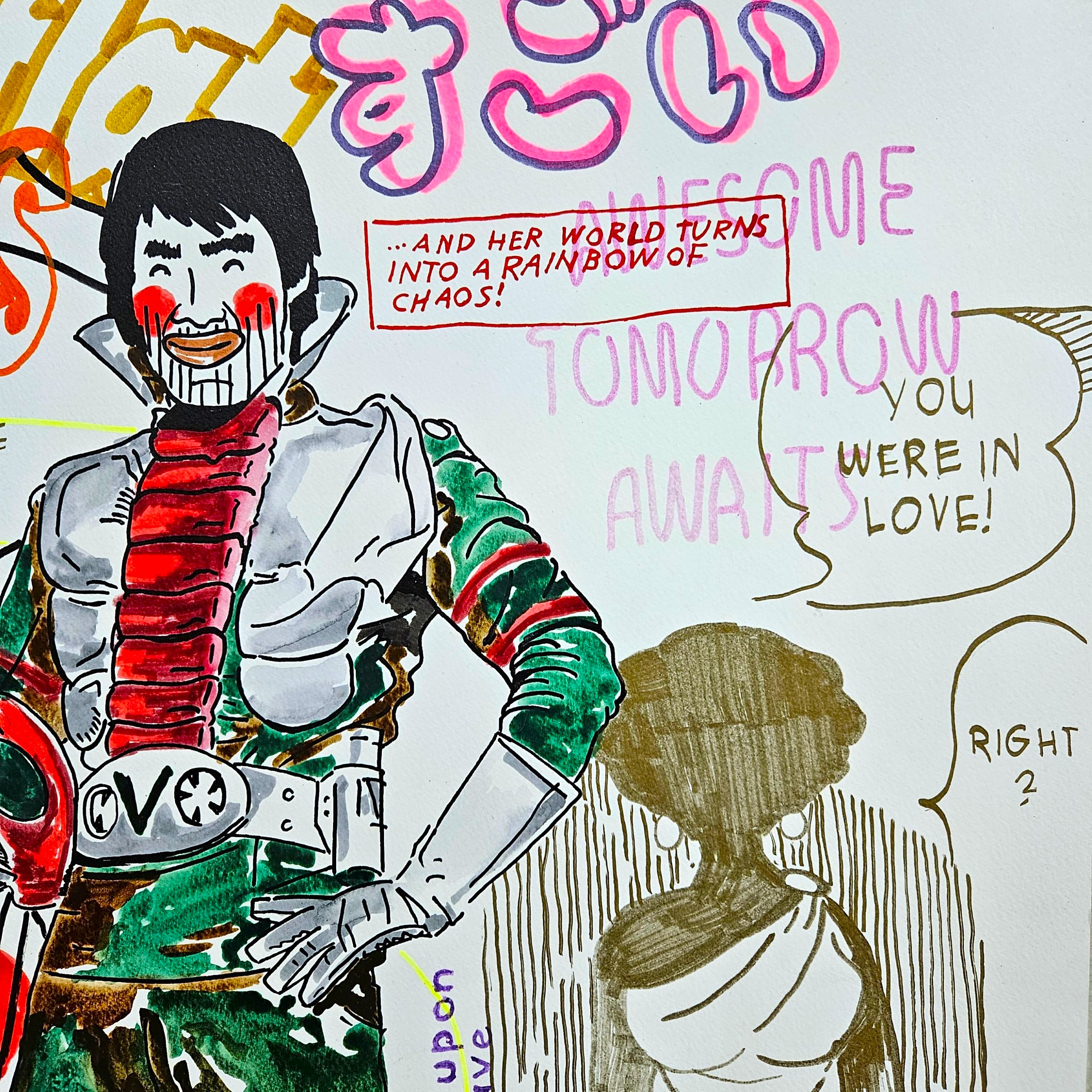 And then, the words. Not there to decorate. They hit: “You were even on TV”. “You were in love”. “Awesome tomorrow awaits”. “...And her world turns into a rainbow of chaos!”. “This is for being stupid”. “Receiving promise in advance”