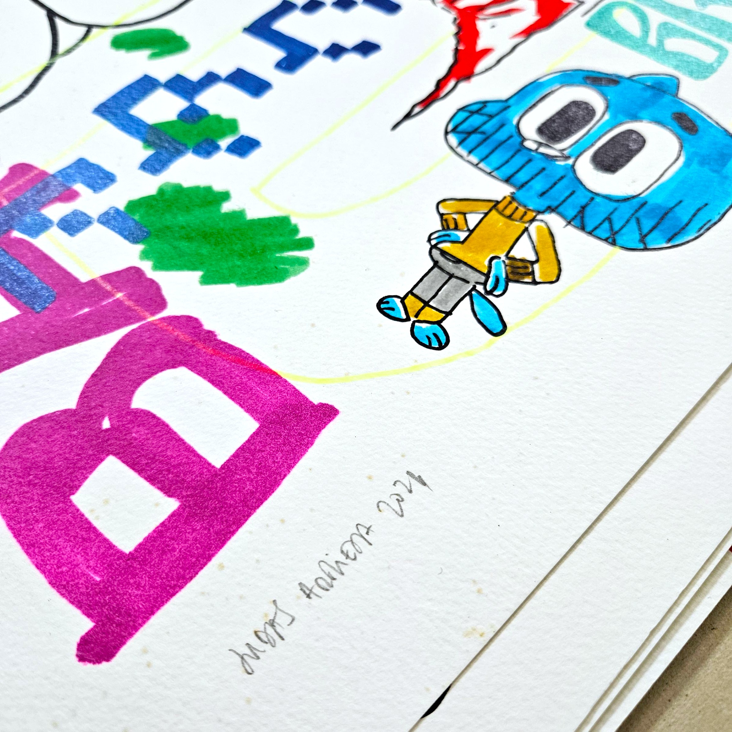 Around him: Gumball, with that ridiculous smile that always hides something. Doraemon’s hand, clutching a remote control. Silent shojo-style girls, drifting like broken promises and unfulfilled desires.