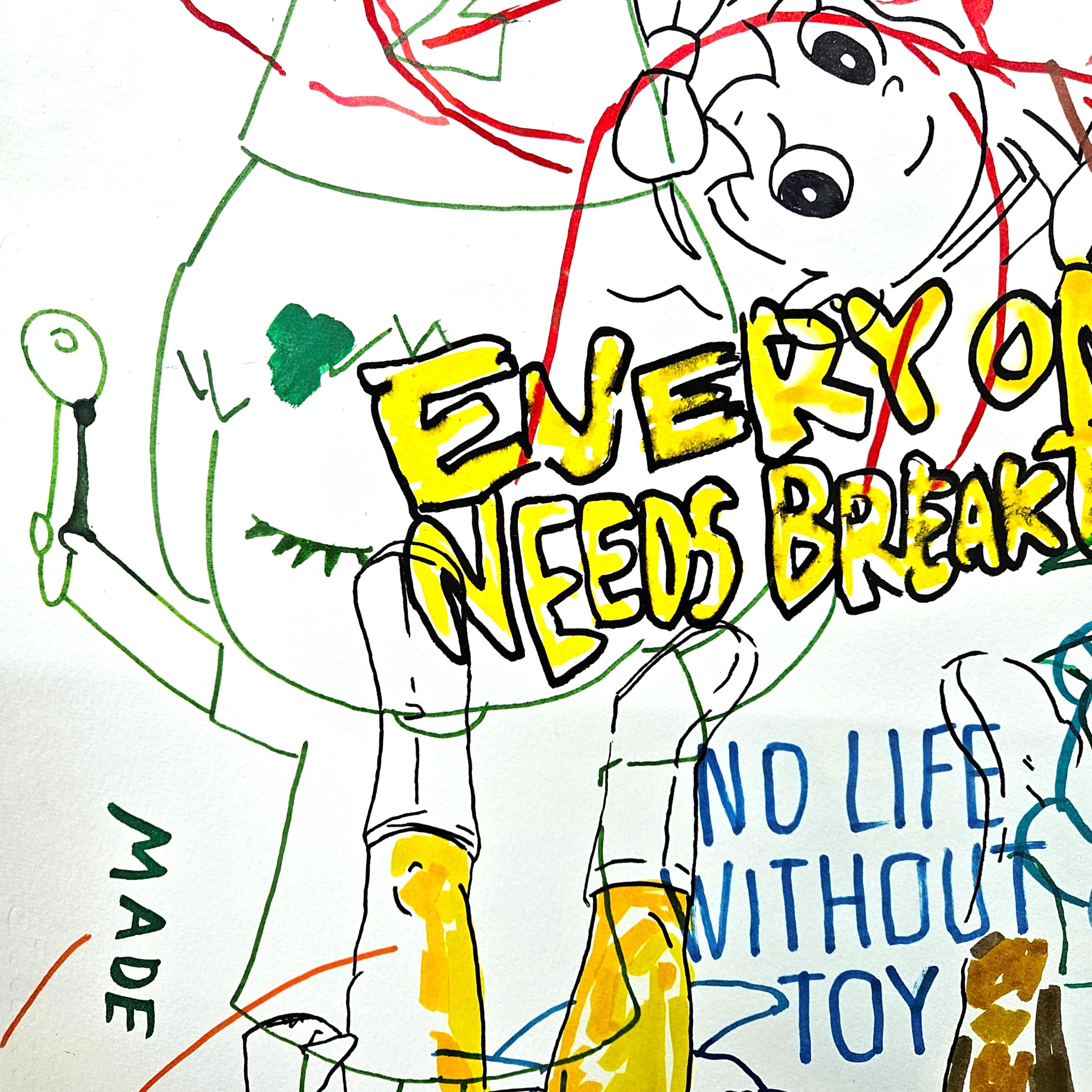 Because this artwork doesn’t tell a story. It throws them all at you at once. Broken promises. Broken identities. Broken toys. “EVERYONE NEEDS BREAKTIME”. “NO LIFE WITHOUT TOY”. “NEXT TIME, I’LL STAY WITH YOU ALL NIGHT. I PROMISE”