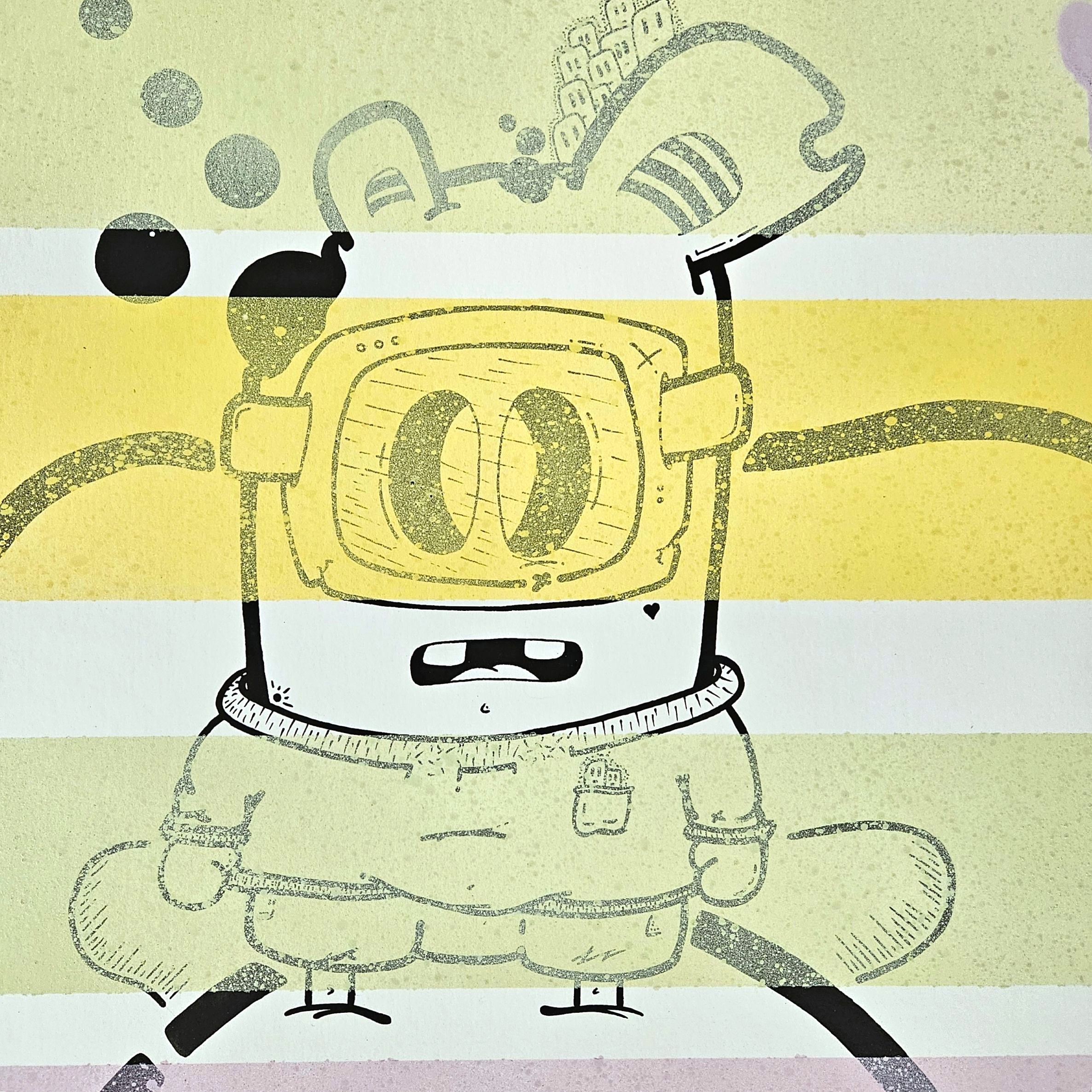 Spray-painted stripes interfere, distort, slice through. They create visual noise. They fragment. But they also draw an emotional map: green stands for balance, yellow for manic euphoria, and violet for emotional collapse. A color code that tracks the inner shifts of mood—
