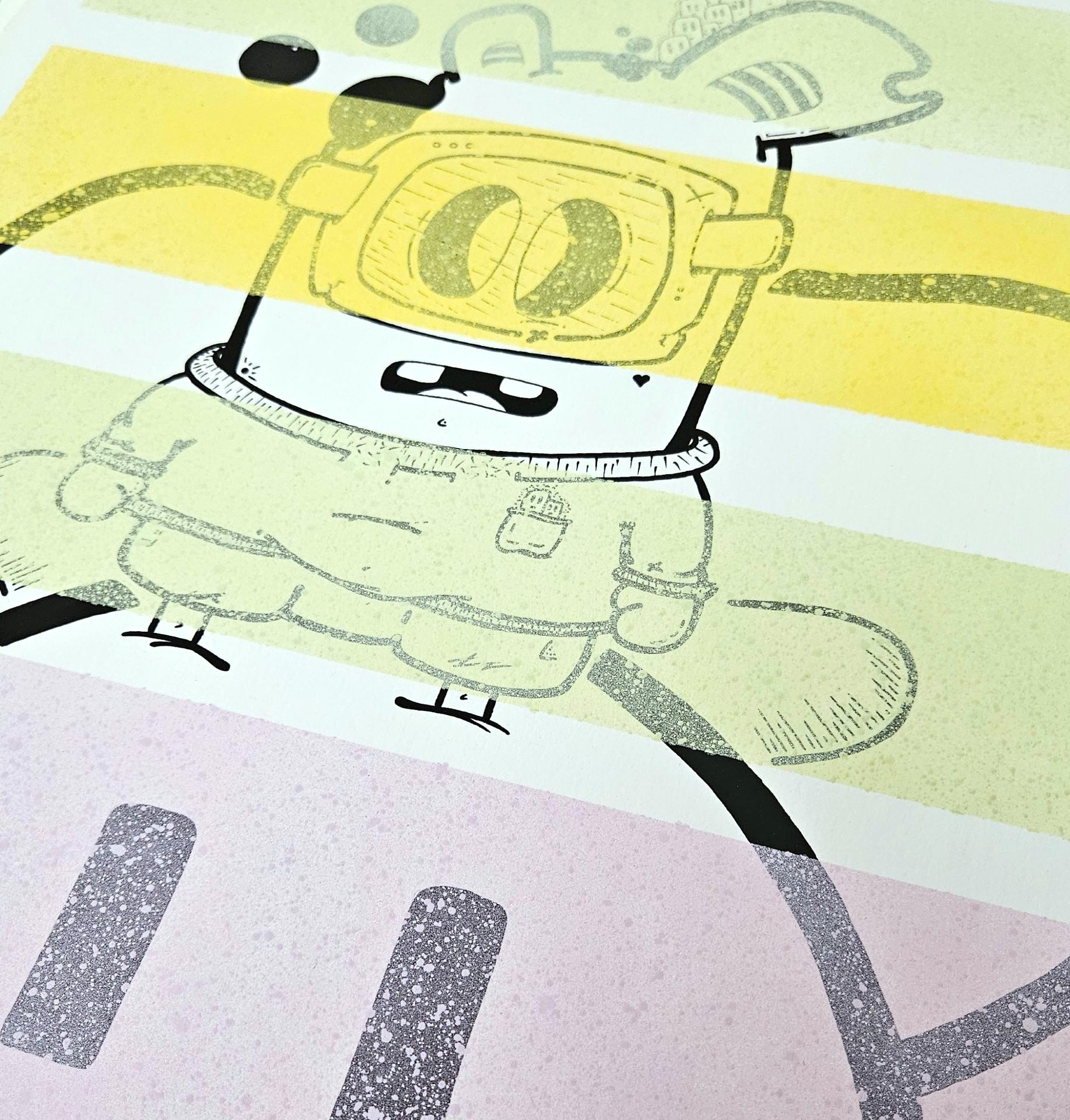 Two characters, two expressions. One smiling. The other tense, nervous, with tiny figures peeking out from his ear and pocket— like thoughts he can no longer contain.