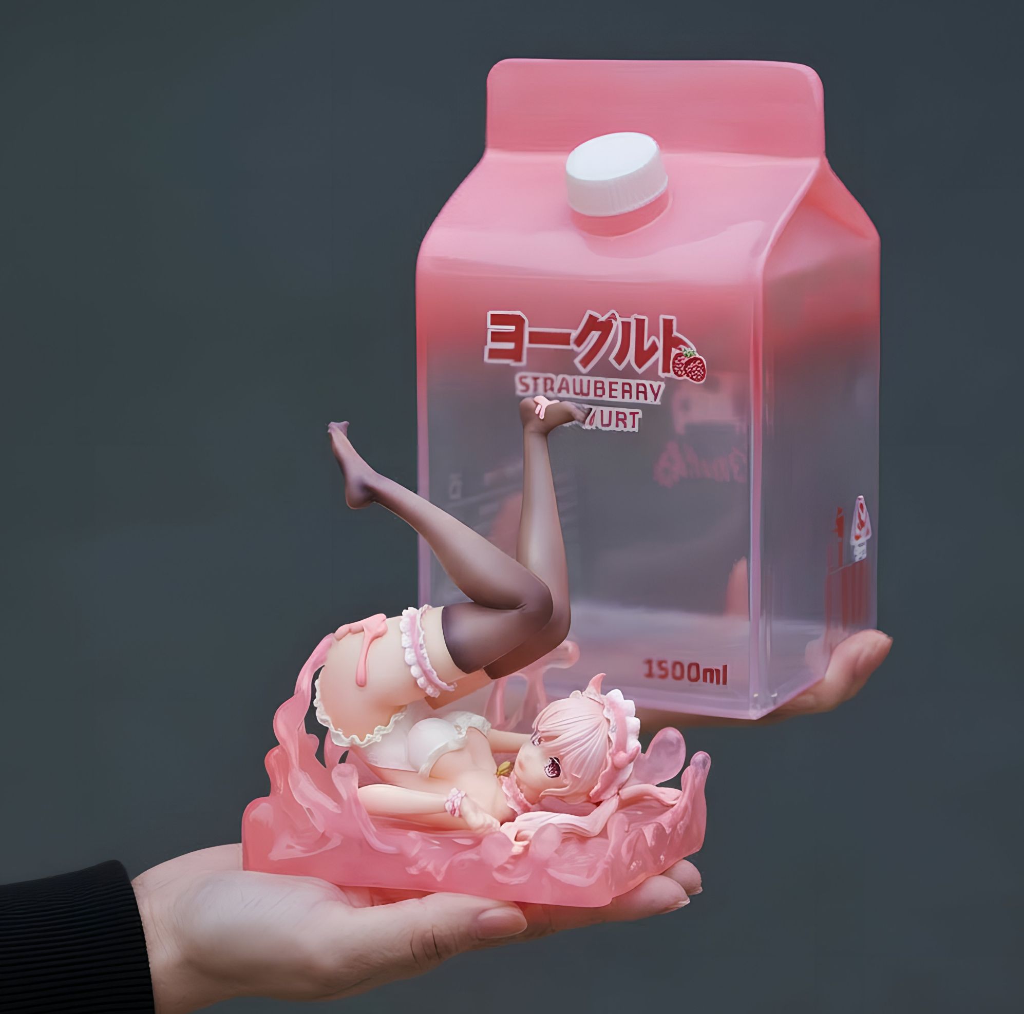 a delicate figure inside a yogurt carton, trapped between sweetness and provocation.